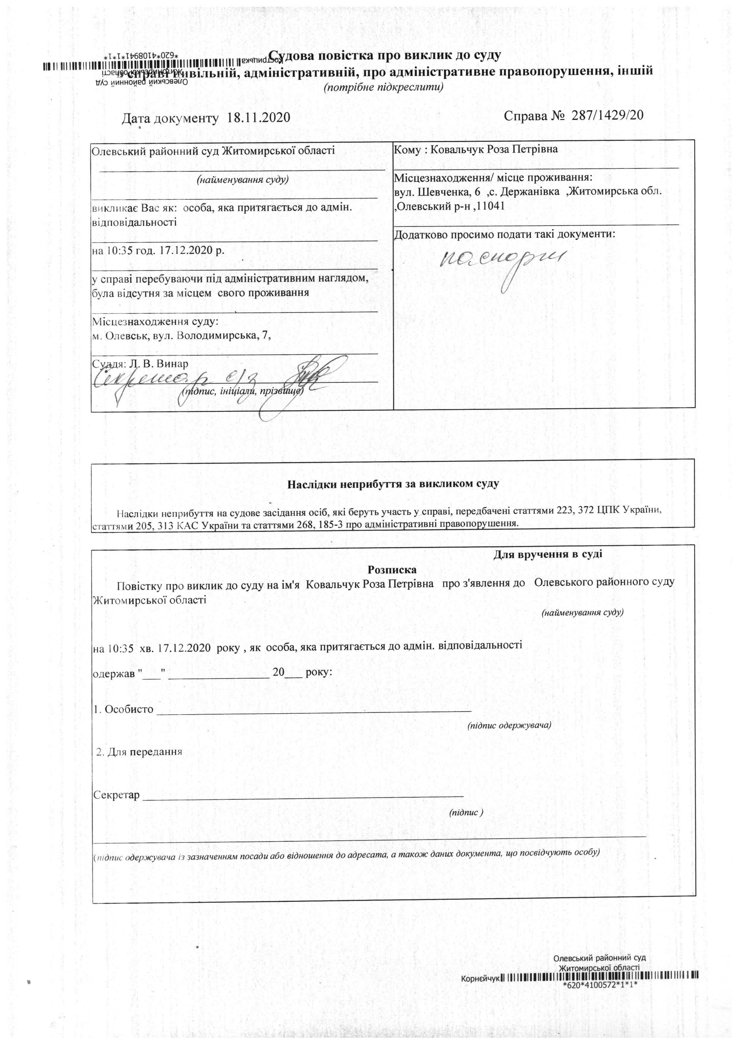 Олевський районний суд Житомирської області викликає Ковальчук Роза Петрівна у справі № 287/1429/20