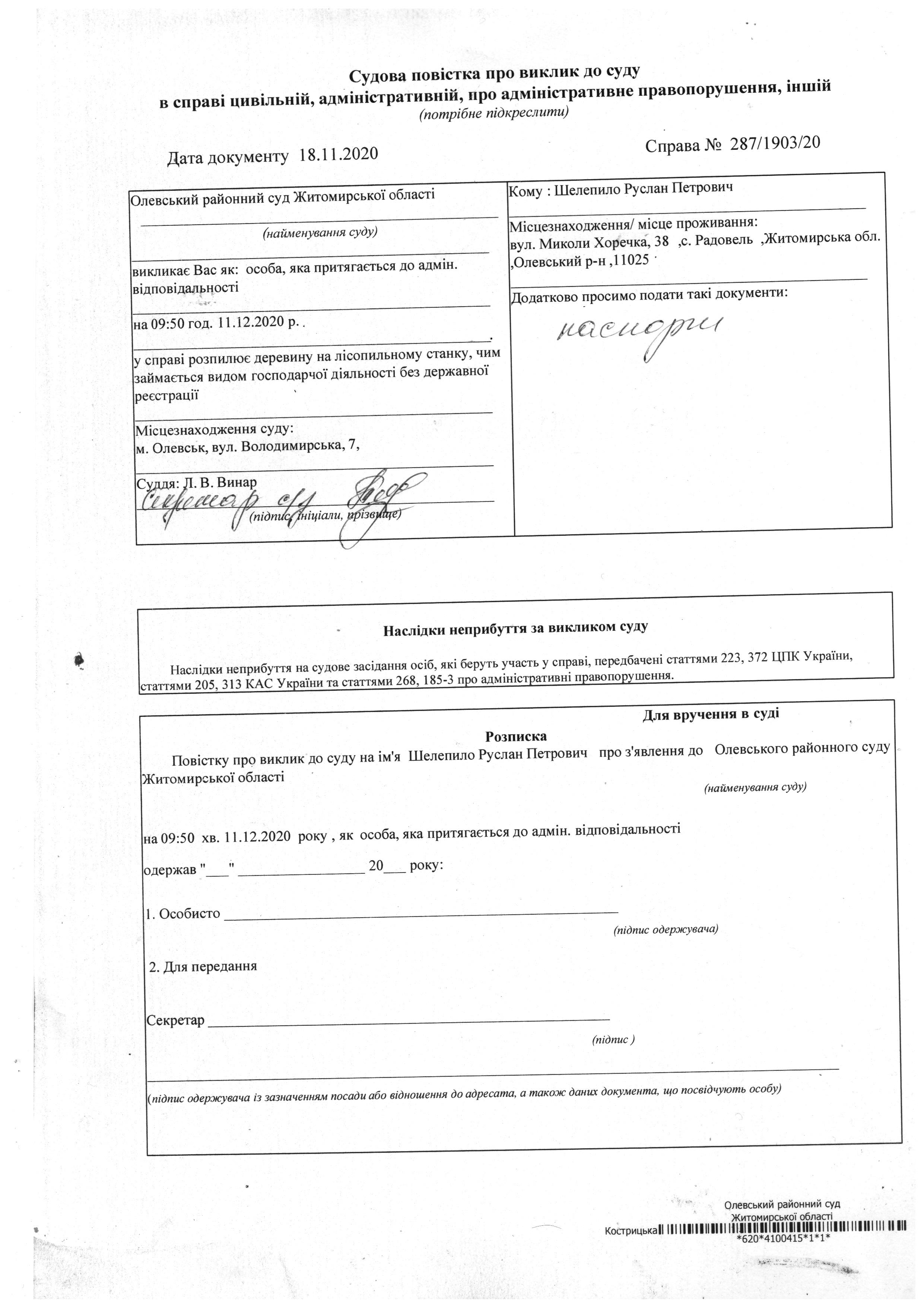 Олевський районний суд Житомирської області викликає Шелепило Руслан Петрович у справі № 287/1903/20