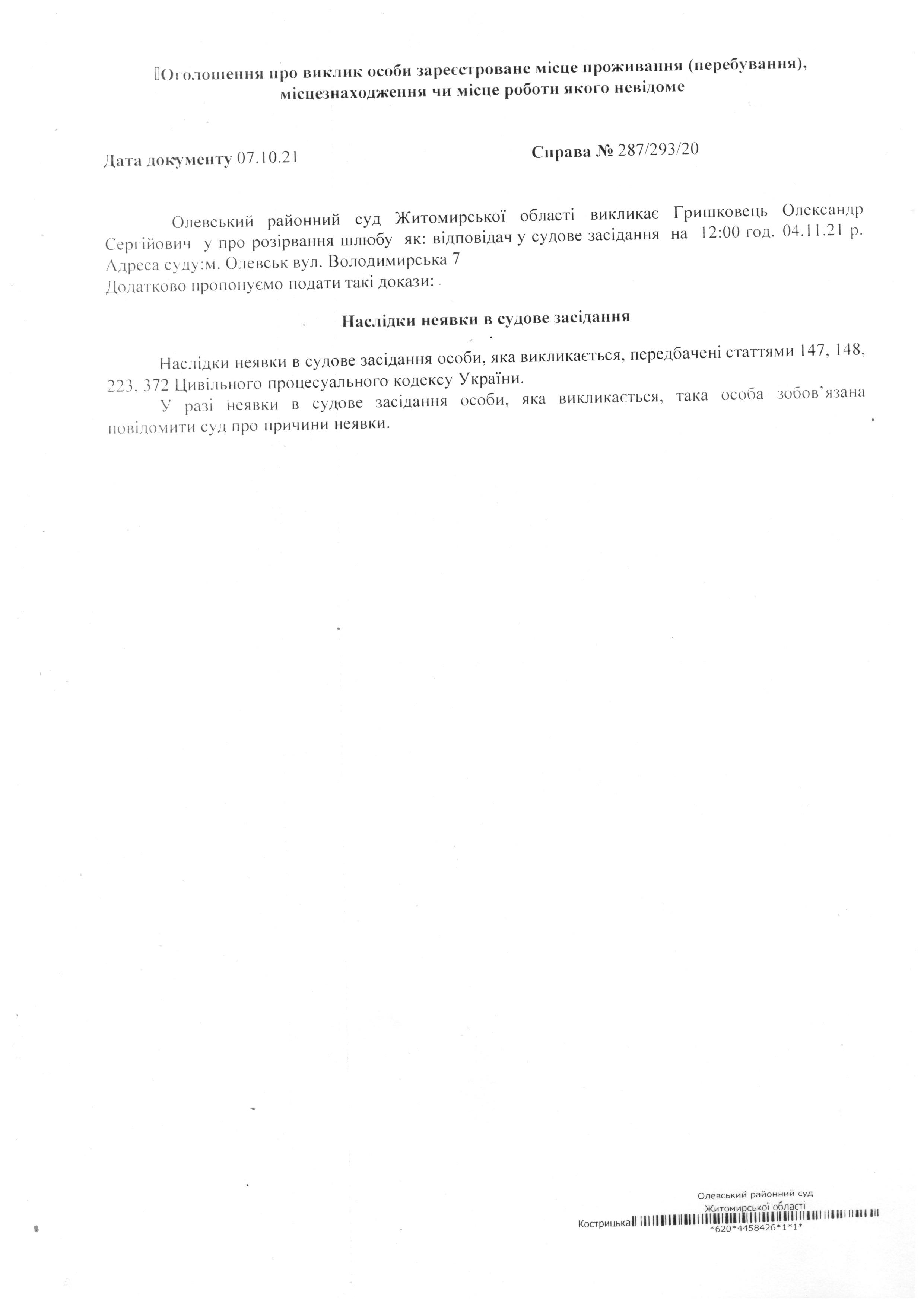 Олевський районний суд Житомирської області викликає Гришковець Олександр Сергійович у справі № 287/293/20