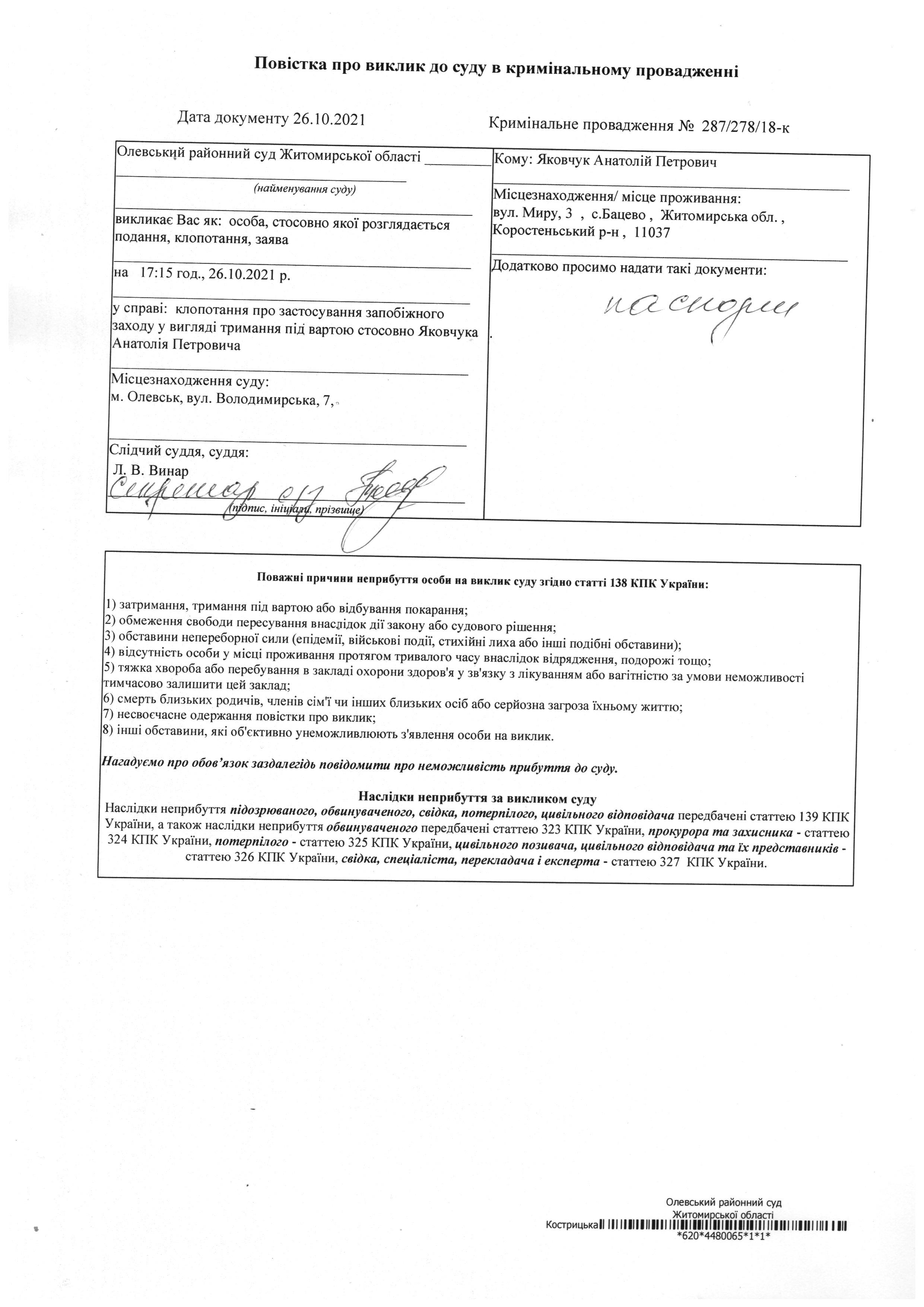 Олевський районний суд Житомирської області викликає Яковчук Анатолій Петрович у справі № 287/278/18-к