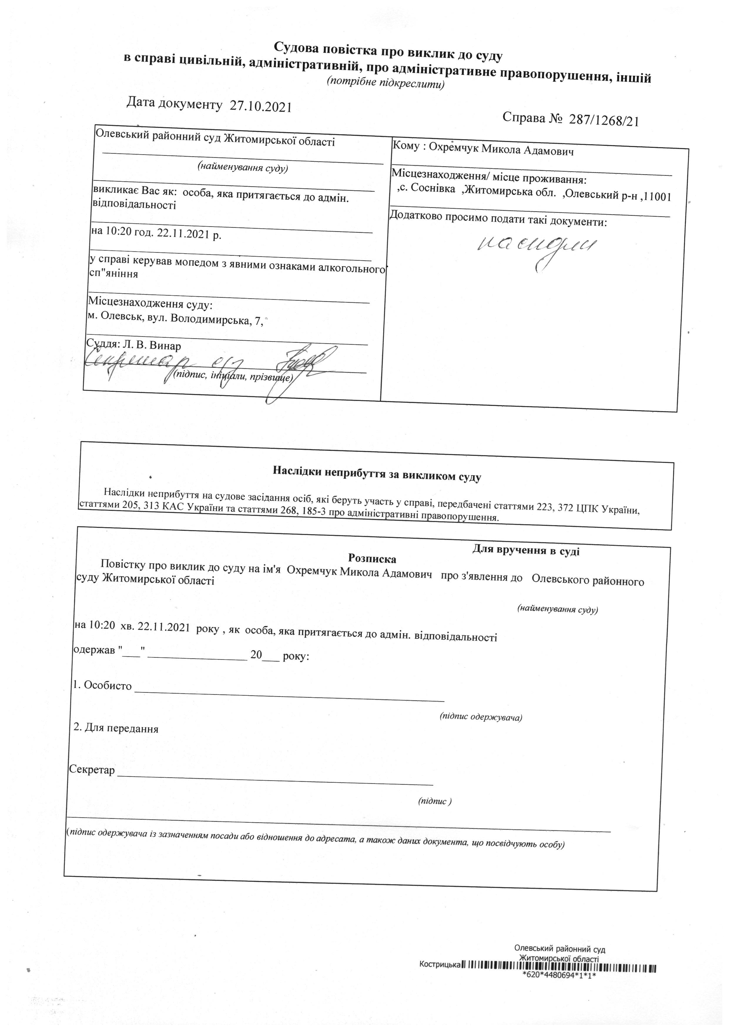 Олевський районний суд Житомирської області викликає Охремчук Микола Адамович у справі № 287/1268/21
