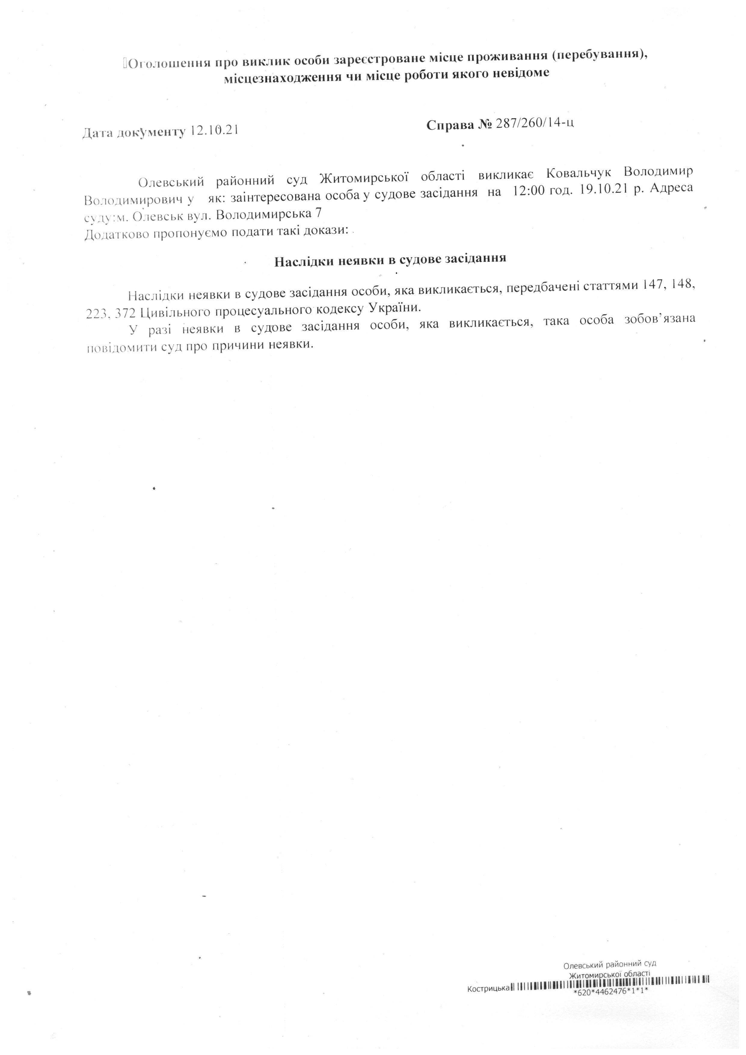 Олевський районний суд Житомирської області викликає Ковальчук Володимир Володимирович у справі № 287/260/14-ц