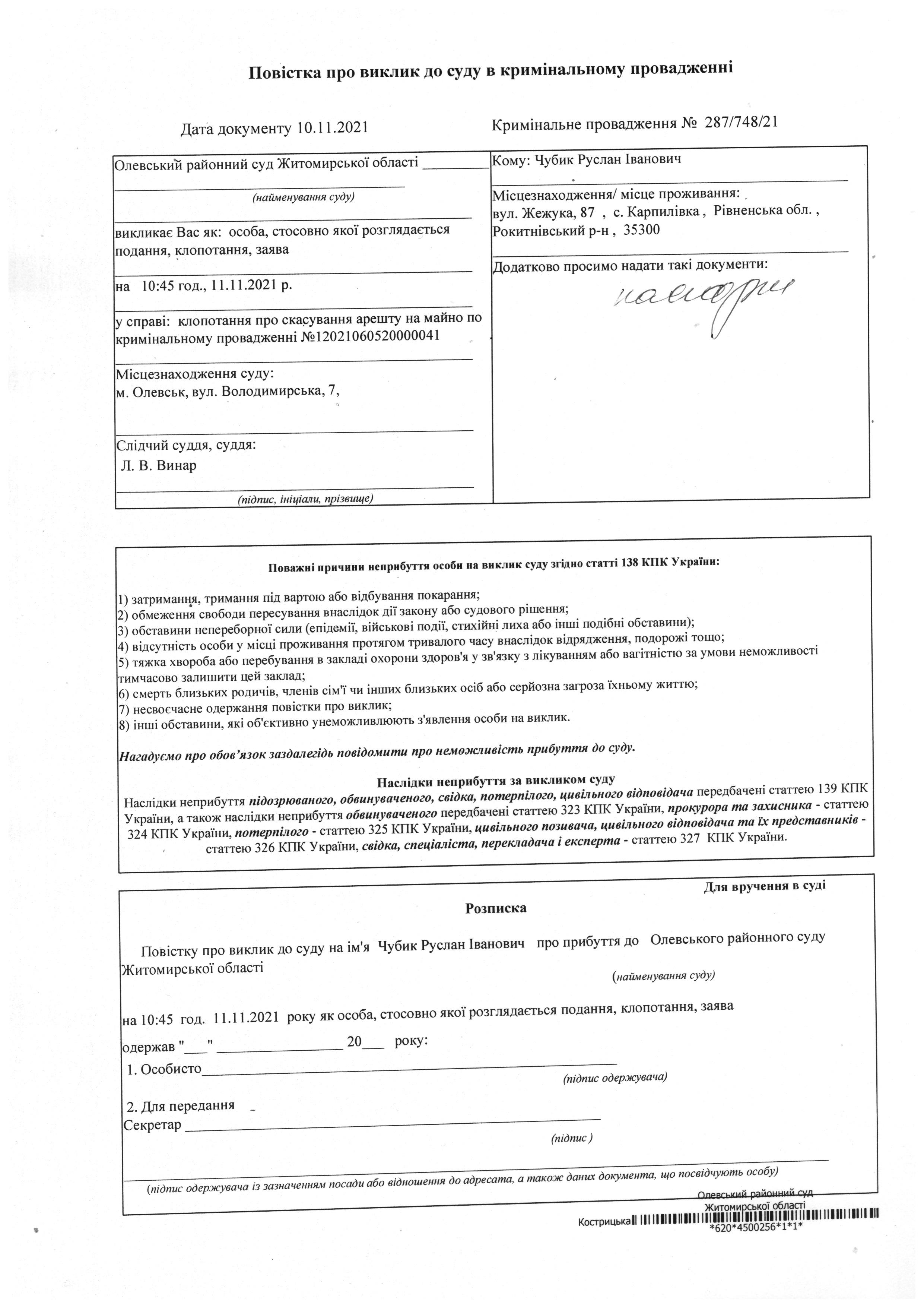 Олевський районний суд Житомирської області викликає Чубик Руслан Іванович у справі № 287/748/21