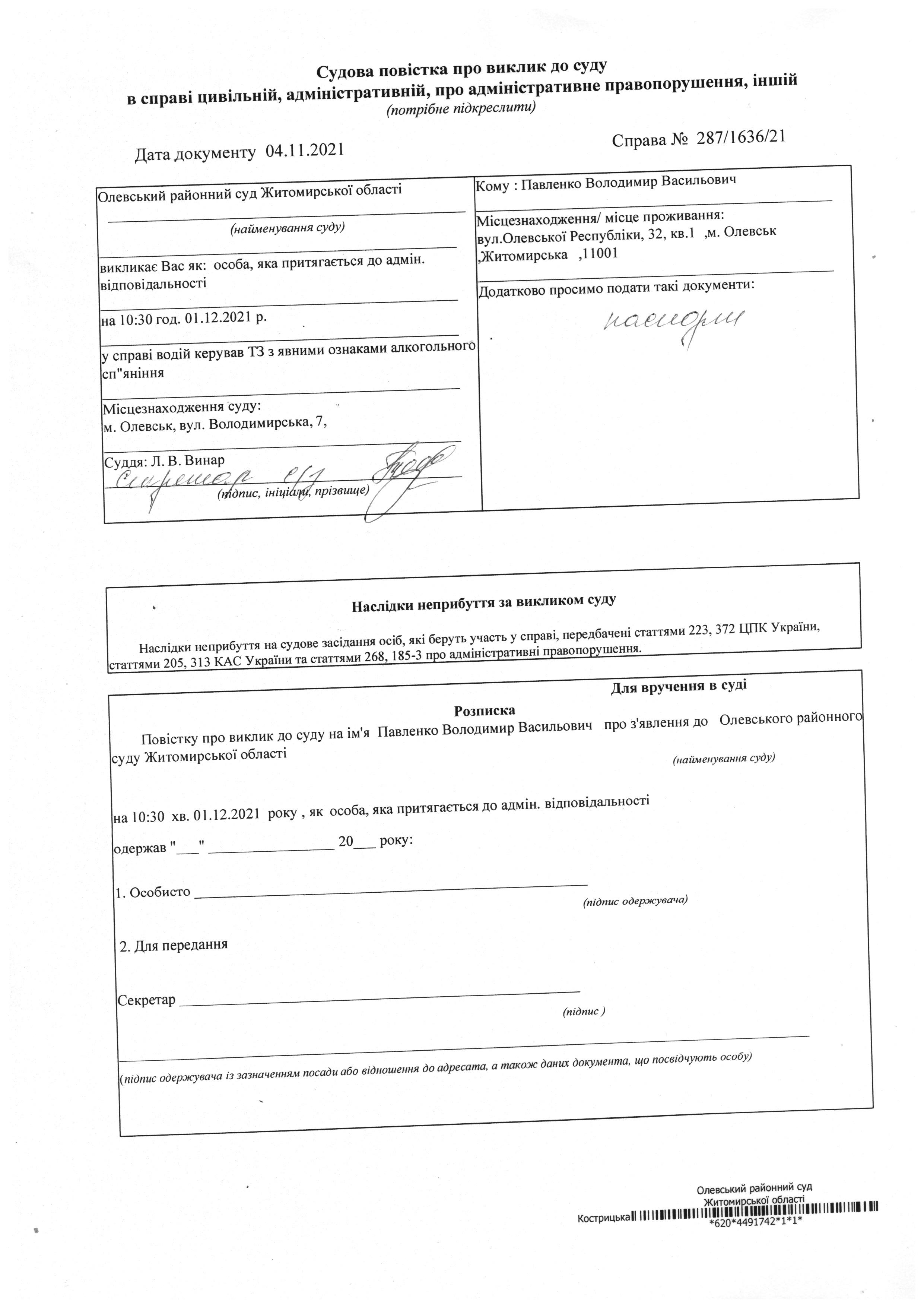 Олевський районний суд Житомирської області викликає Павленко Володимир Васильович у справі № 287/1636/21