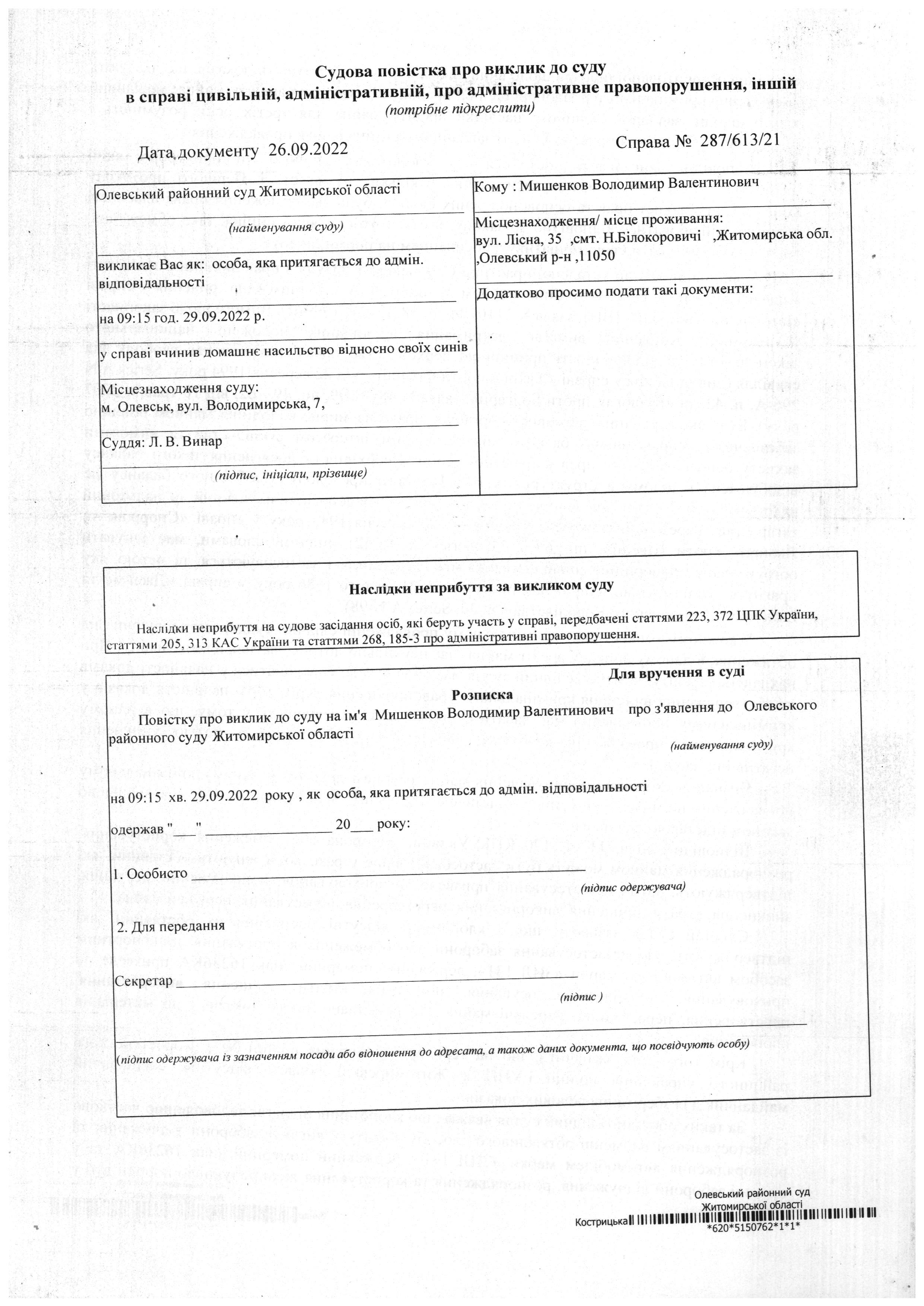 Олевський районний суд Житомирської області викликає Мишенков Володимир Валентинович у справі № 287/613/21