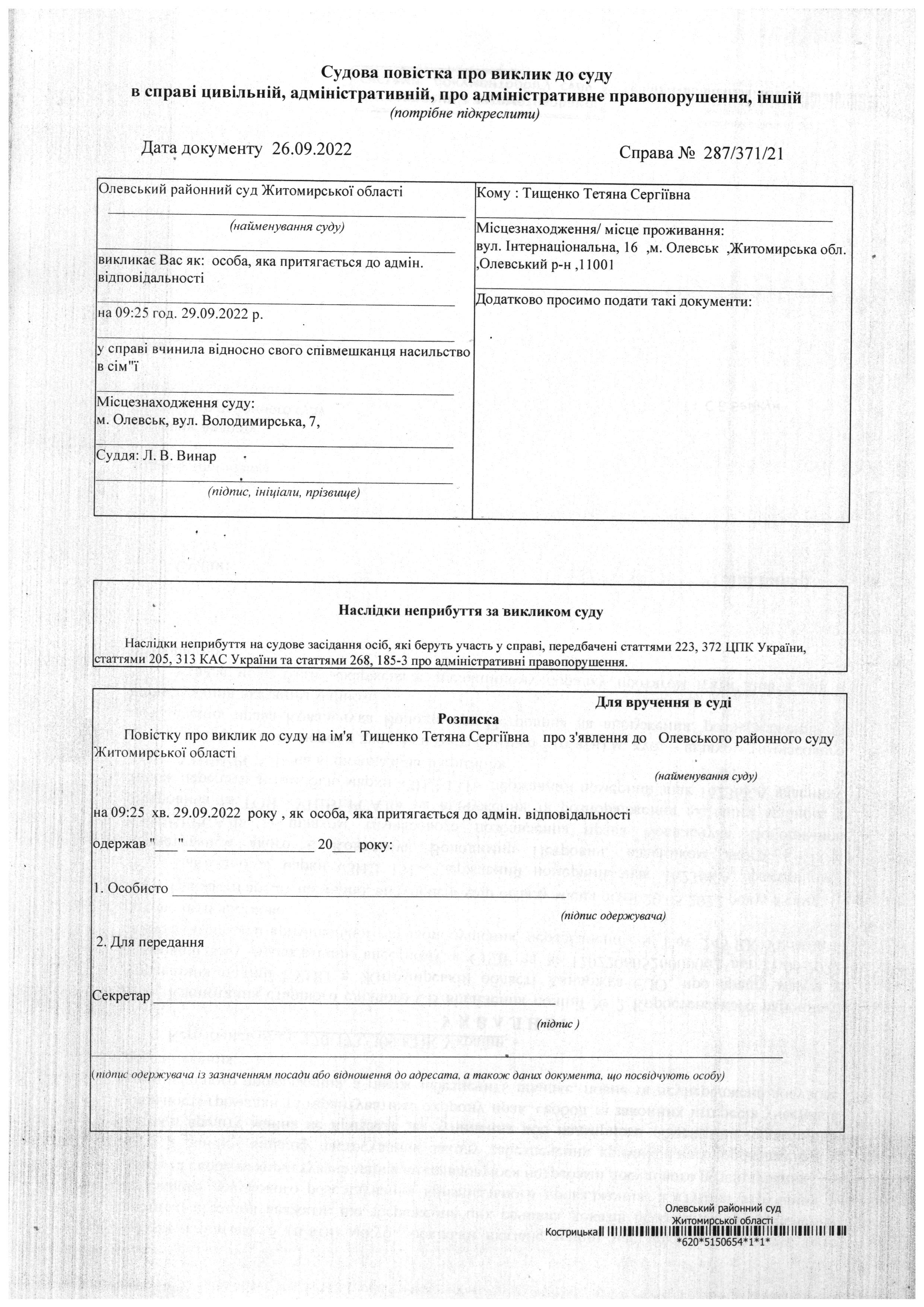 Олевський районний суд Житомирської області викликає Тищенко Тетяна Сергіївна у справі № 287/371/21
