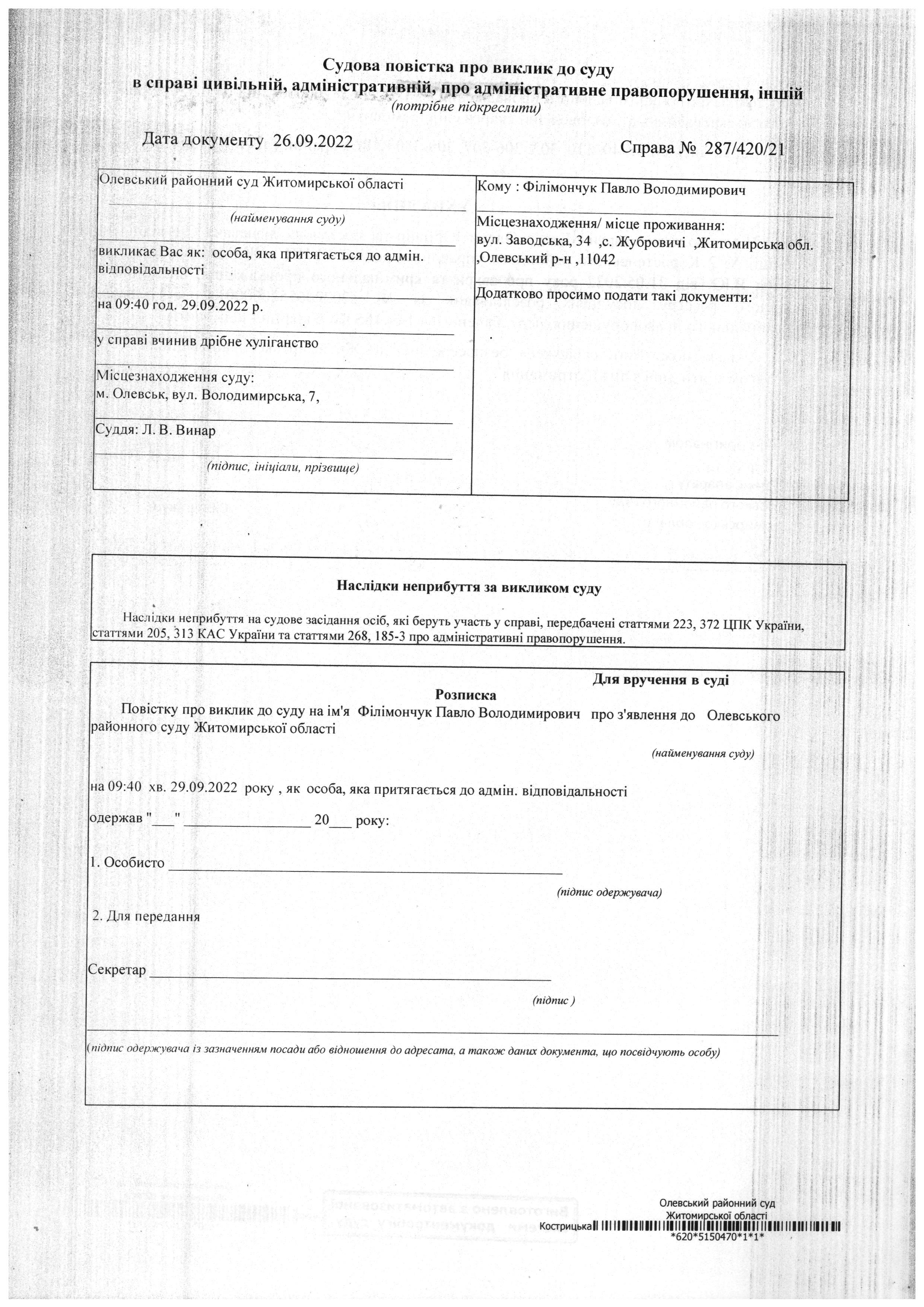 Олевський районний суд Житомирської області викликає Філімончук Павло Володимирович у справі № 287/420/21