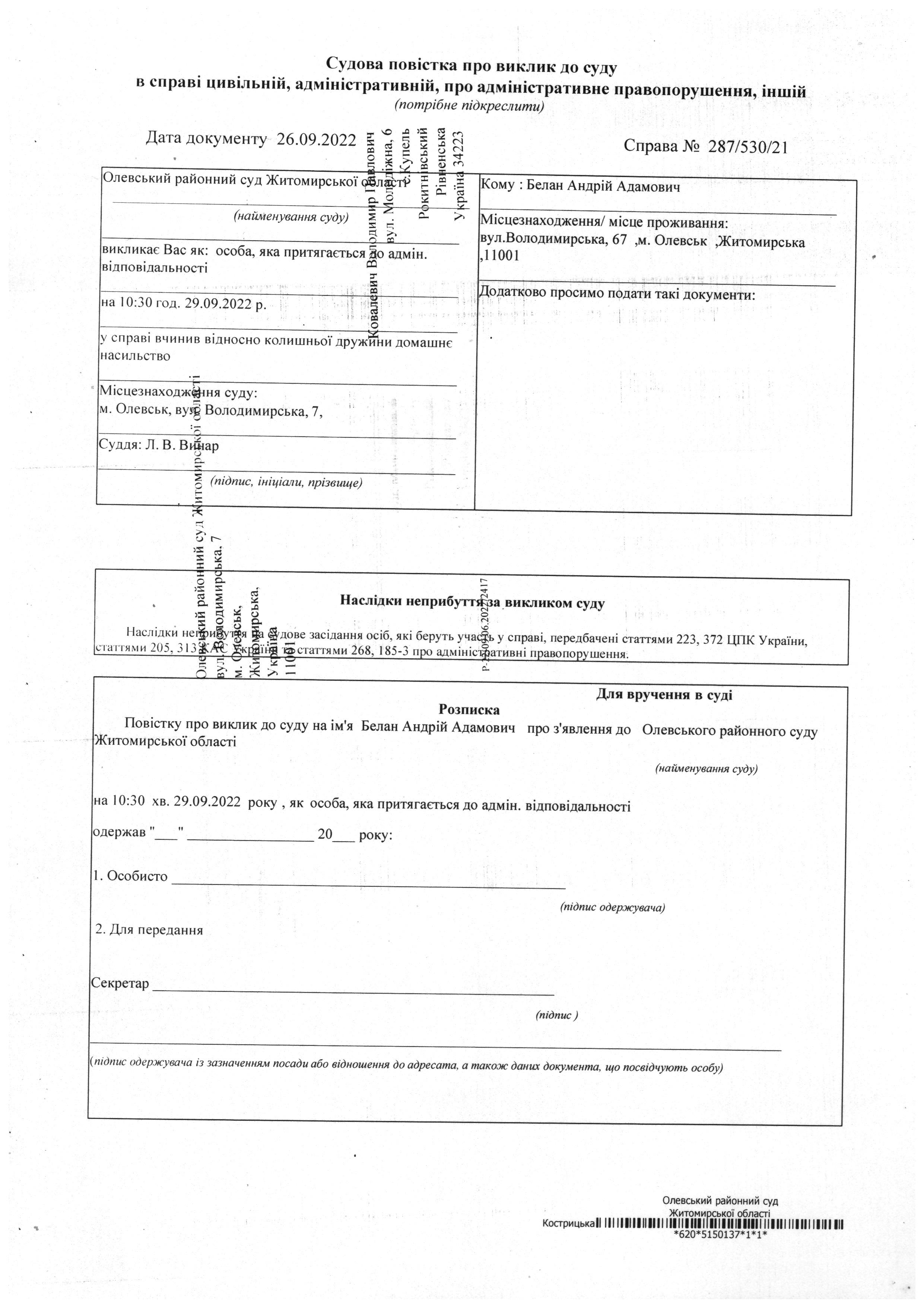 Олевський районний суд Житомирської області викликає Белан Андрій Адамович у справі № 287/530/21