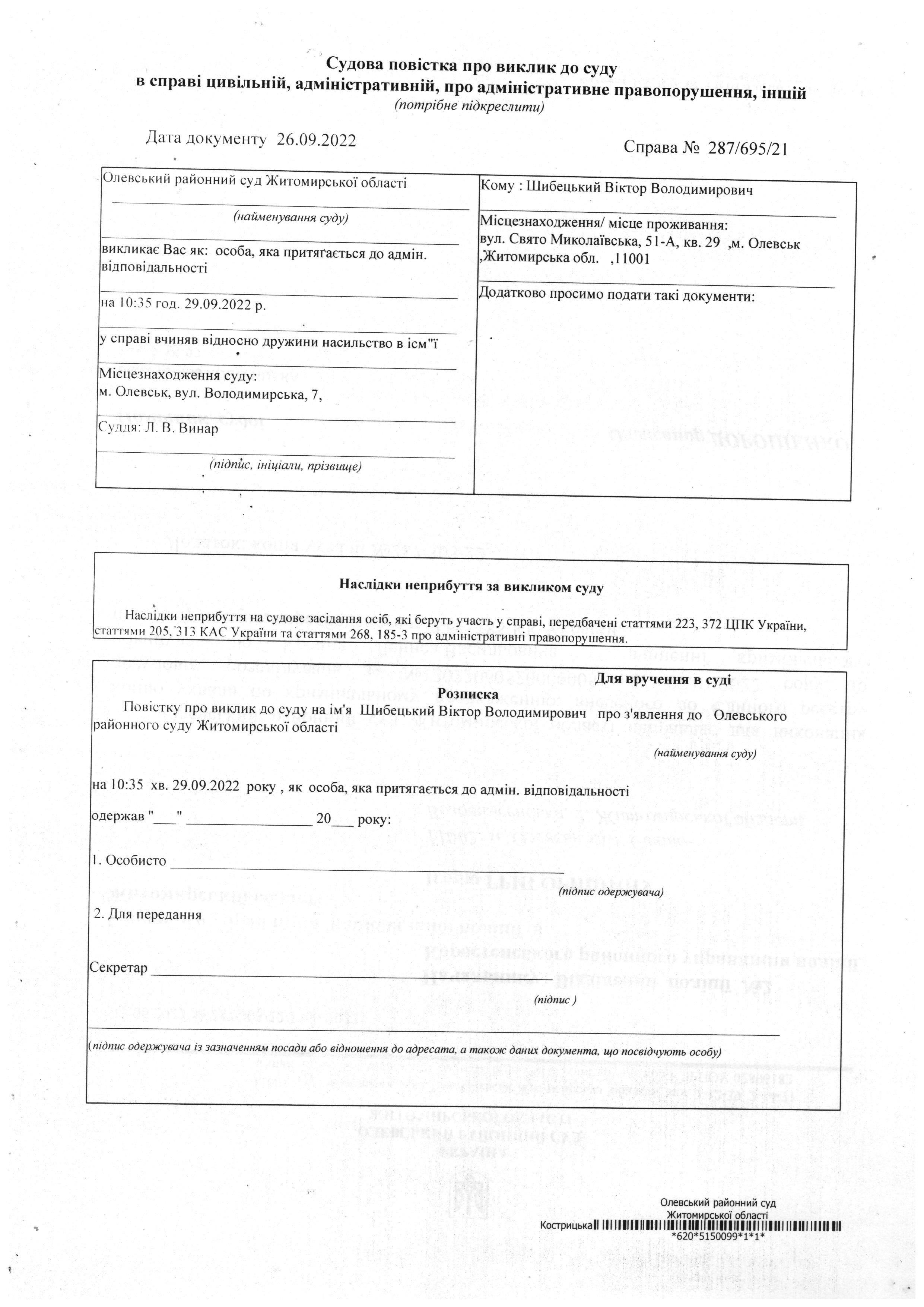 Олевський районний суд Житомирської області викликає Шибецький Віктор Володимирович у справі № 287/695/21