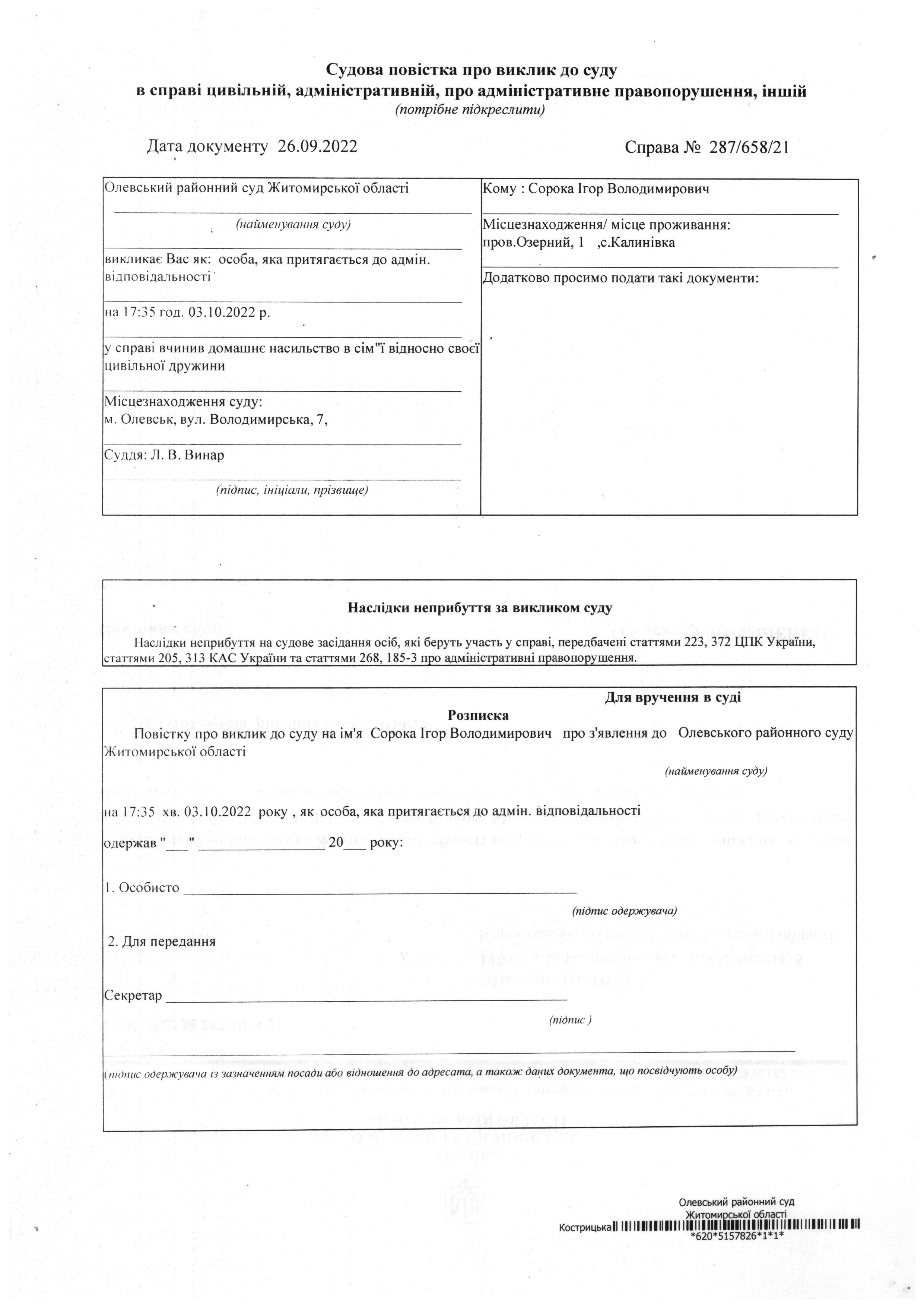 Олевський районний суд Житомирської області викликає Сорока Ігор Володимирович у справі № 287/658/21
