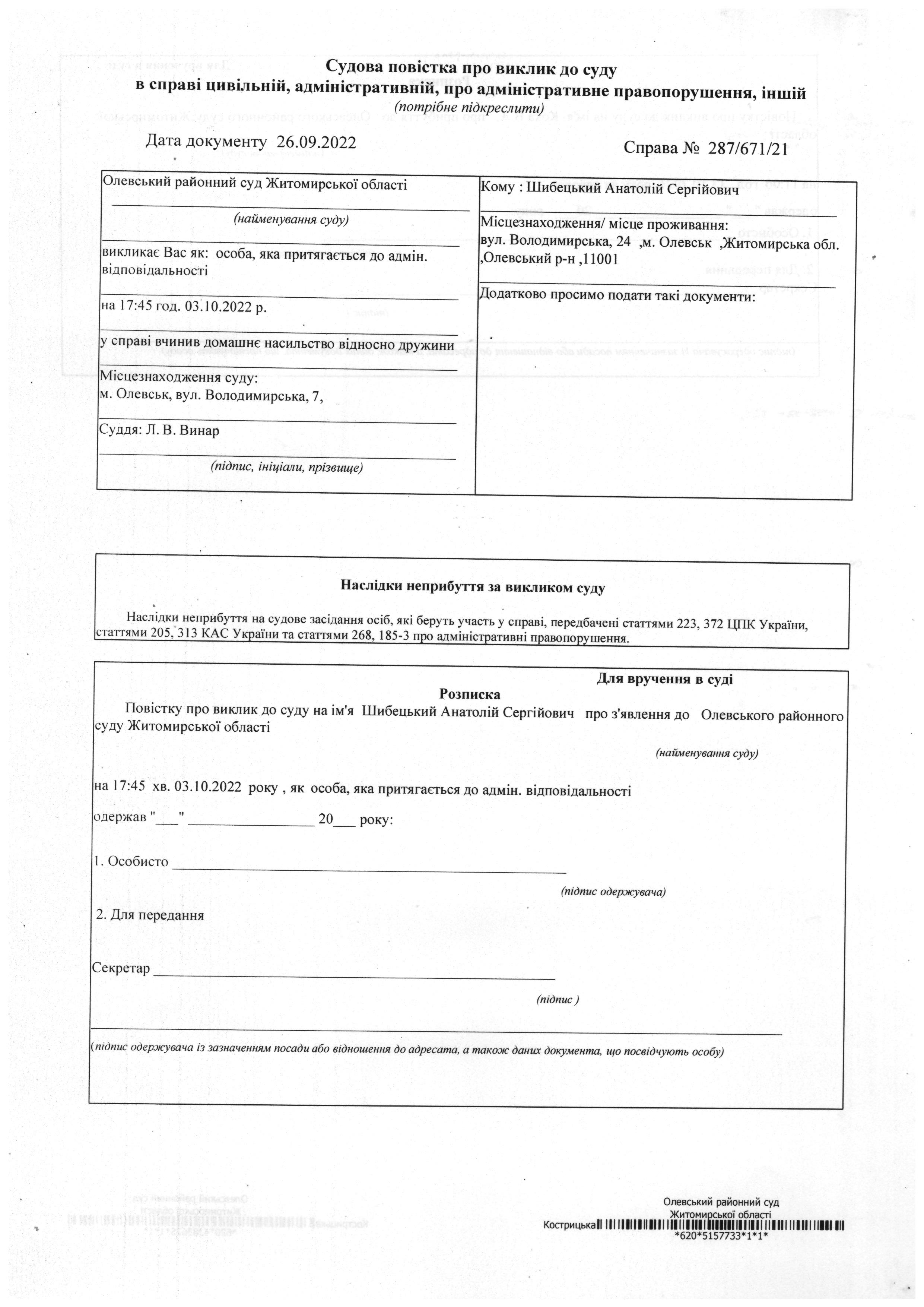 Олевський районний суд Житомирської області викликає Шибецький Анатолій Сергійович у справі № 287/671/21