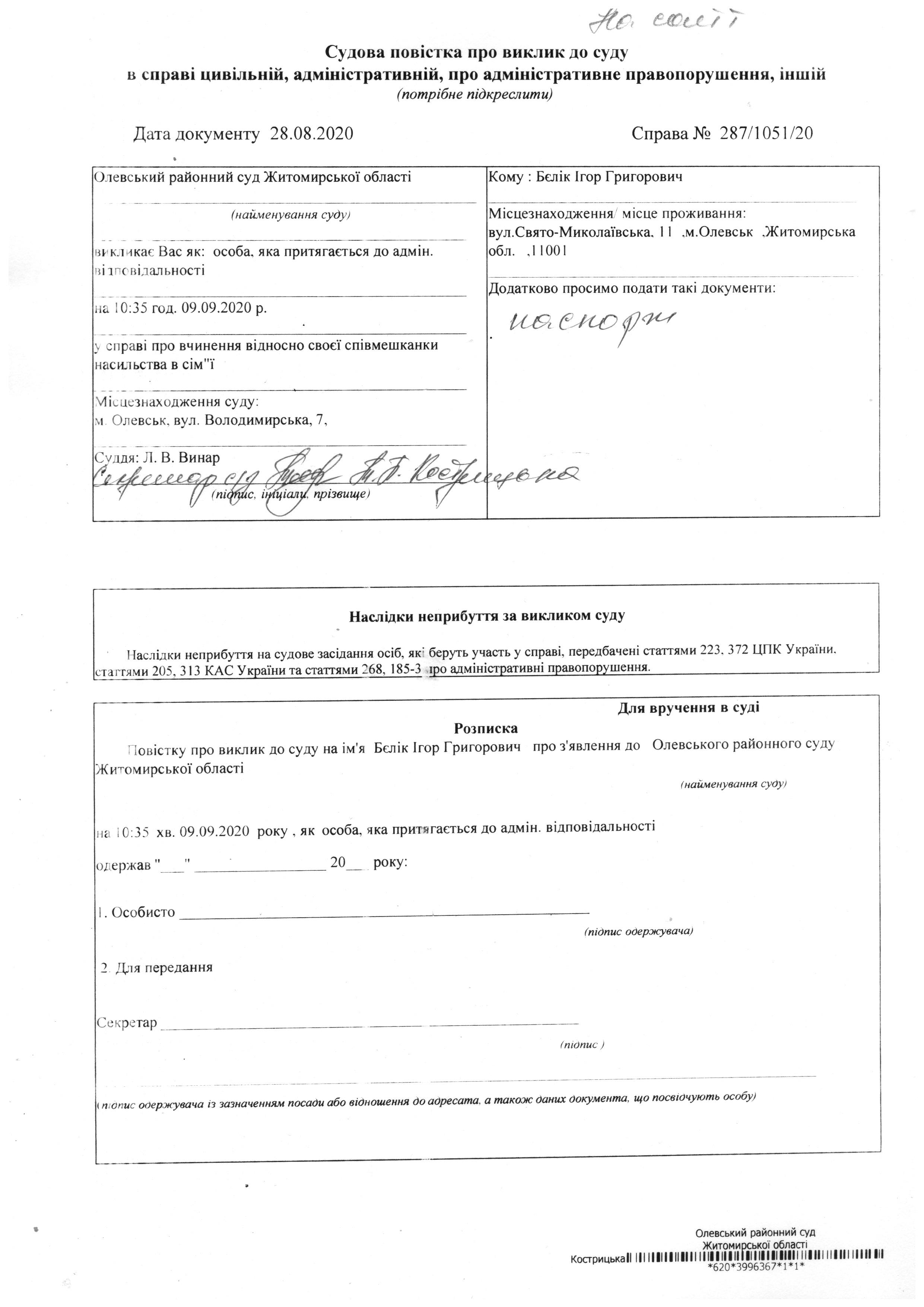 Олевський районний суд Житомирської області викликає Бэлік Ігор Григорович у справі № 287/1051/20