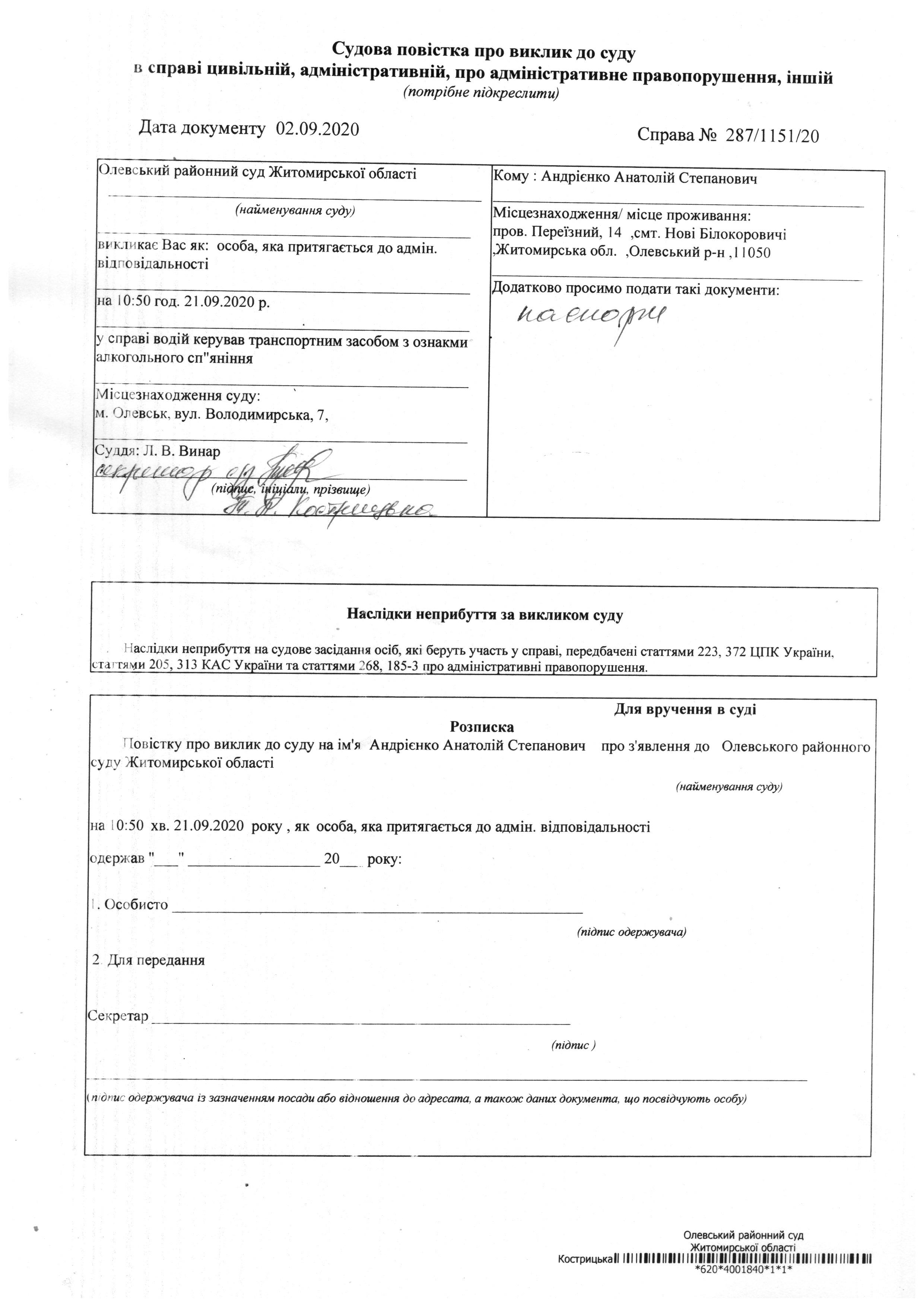 Олевський районний суд Житомирської області викликає Андрієнко Анатолій Степанович у справі № 287/1151/20