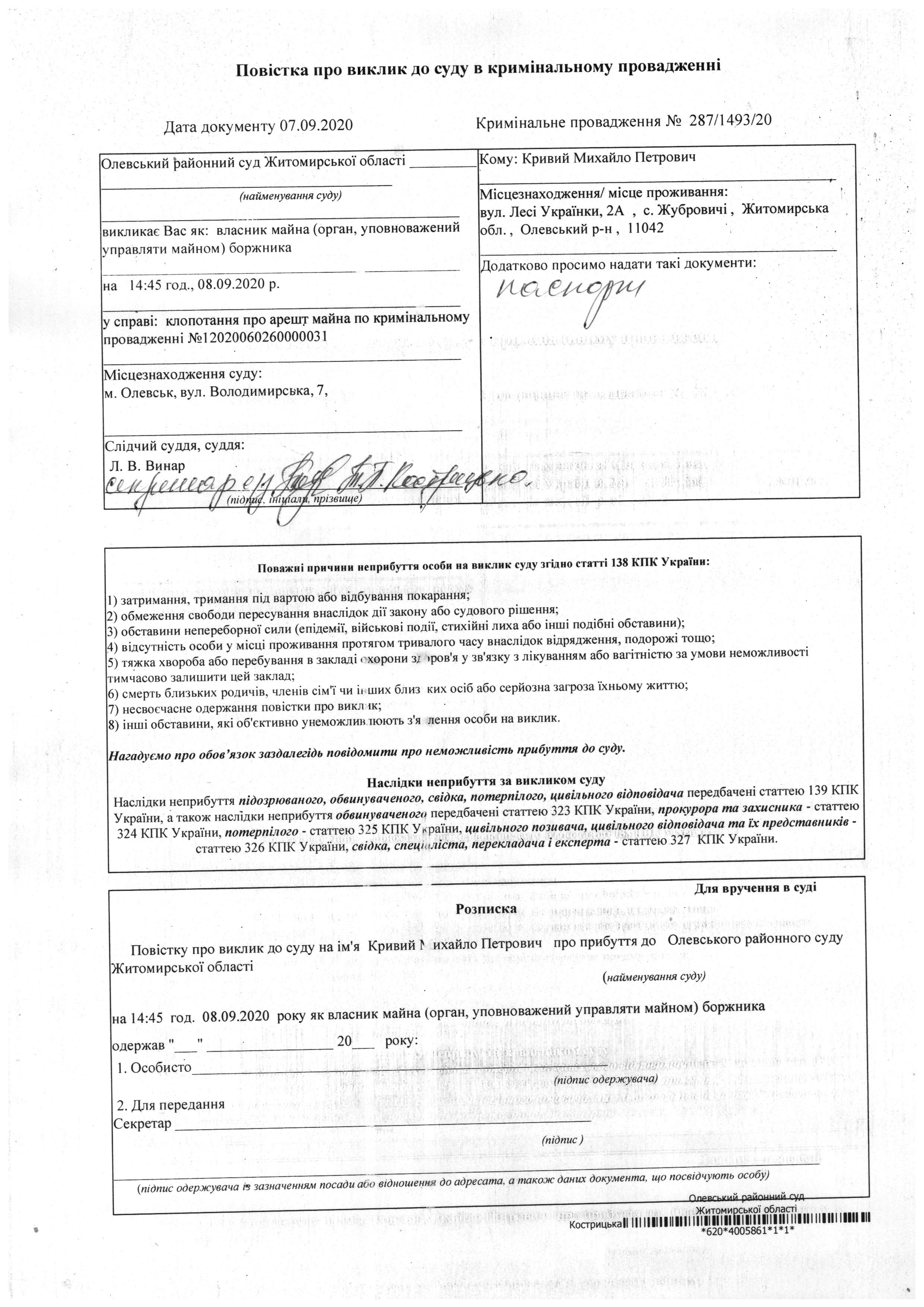 Олевський районний суд Житомирської області викликає Кривой Михайло Петрович у справі № 287/1493/20
