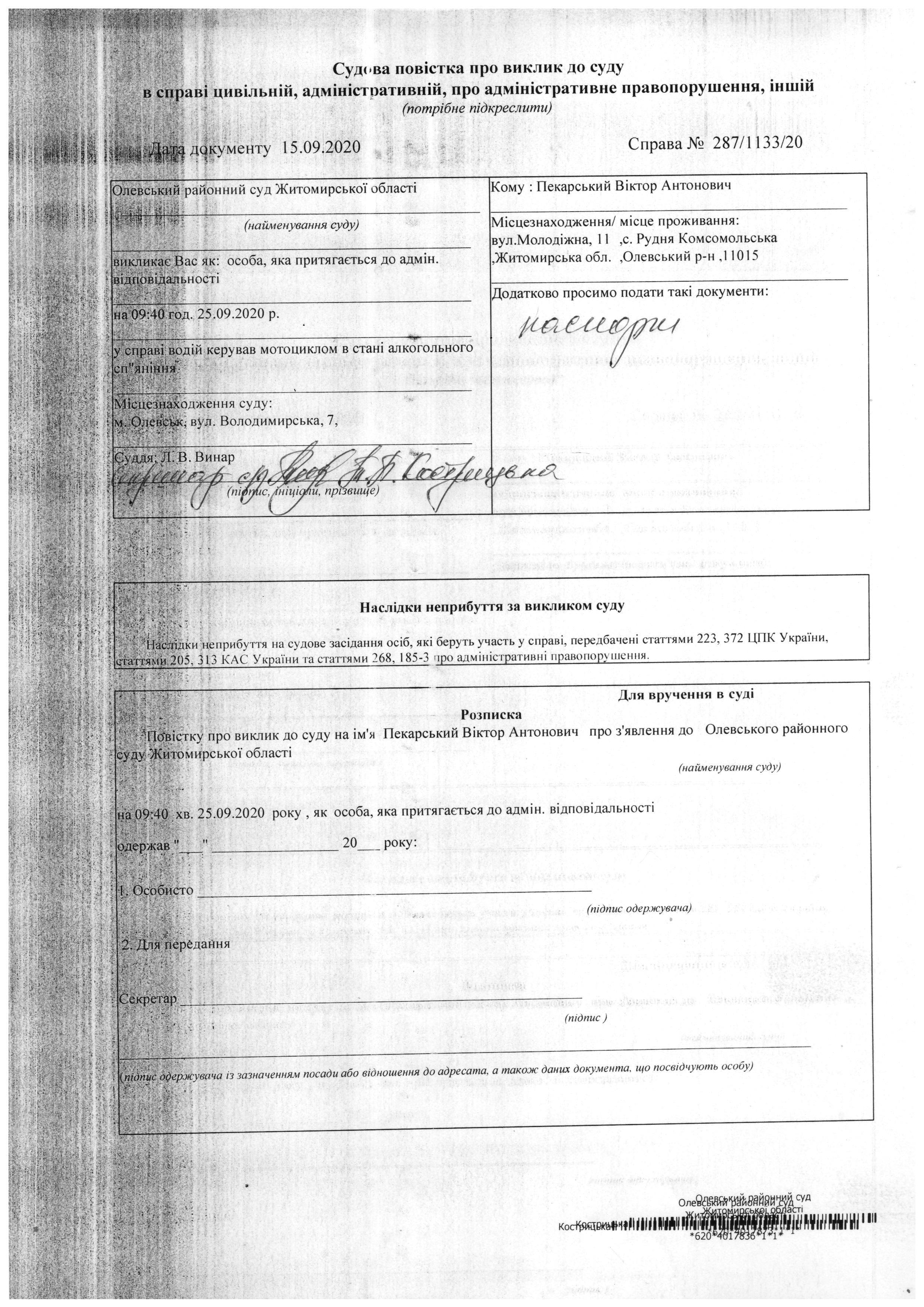 Олевський районний суд Житомирської області викликає Пекарський Віктор Антонович у справі № 287/1133/20
