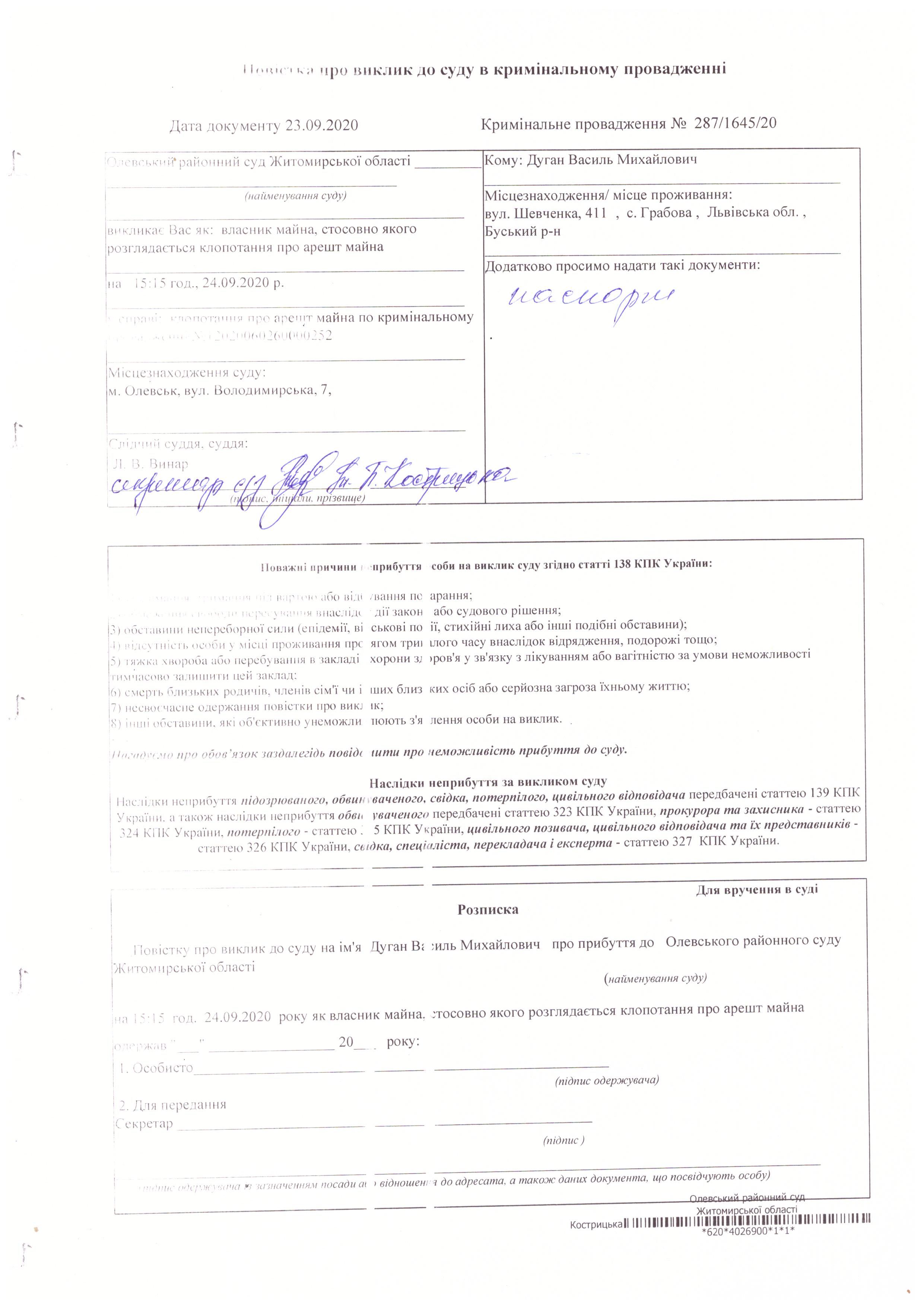 Олевський районний суд Житомирської області викликає Дуган Василь Михайлович у справі № 287/1645/20