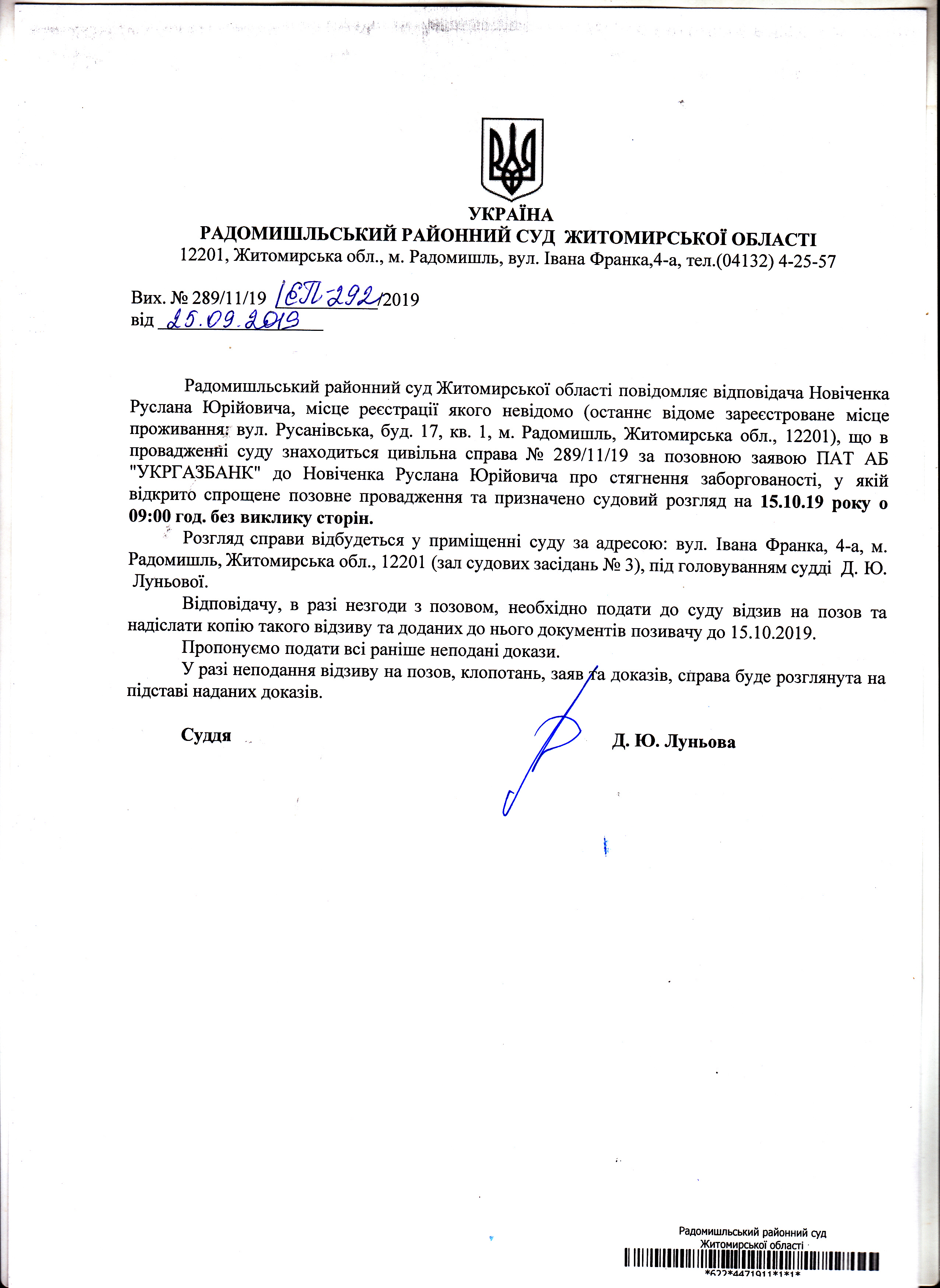 Оголошення про розгляд цивільної справи за за позовною заявою ПАТ АБ "УКРГАЗБАНК" до Новіченка Руслана Юрійовича про стягнення заборгованості
