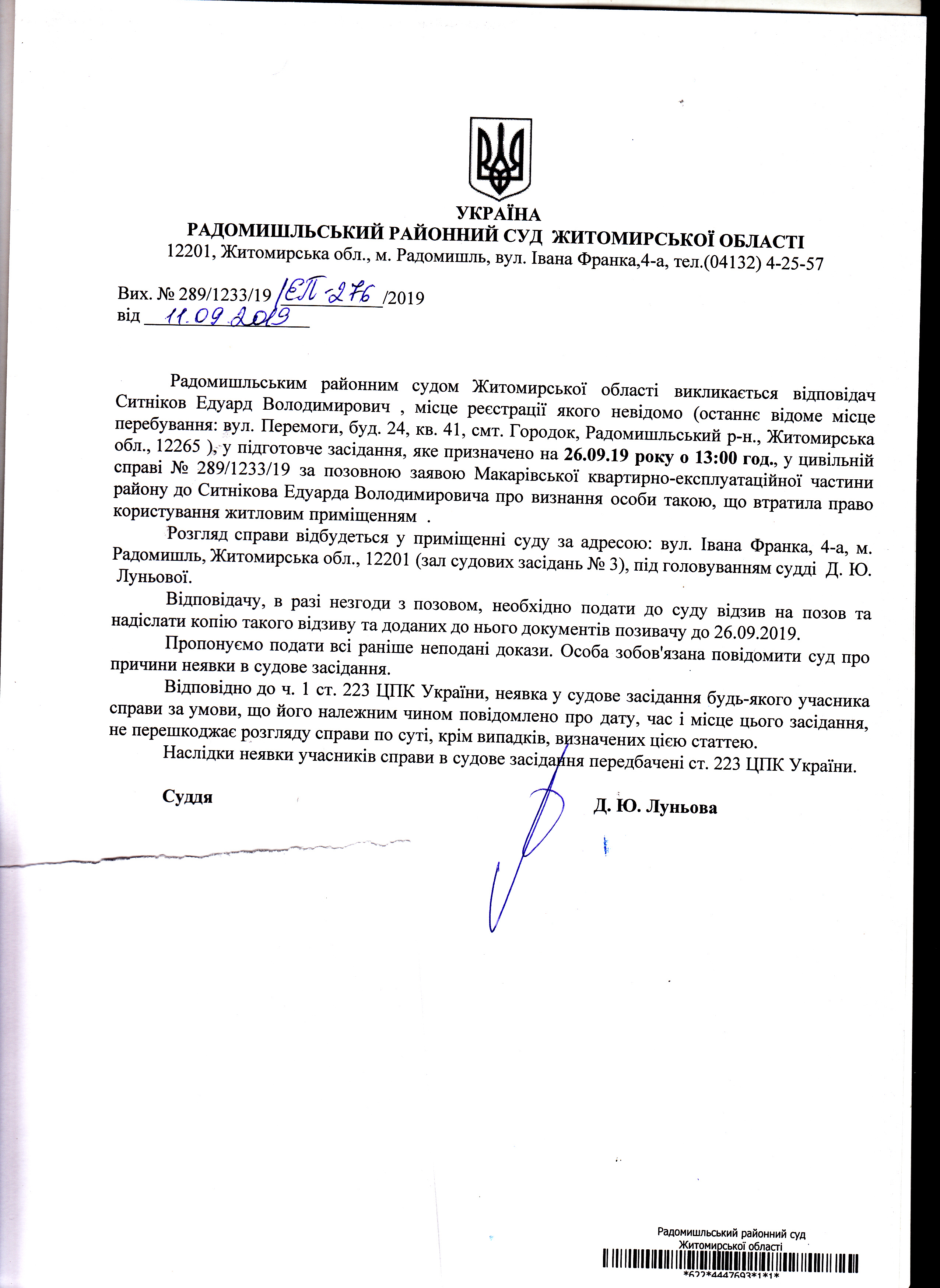 Оголошення про виклик до суду Ситнікова Едуарда Володимировича