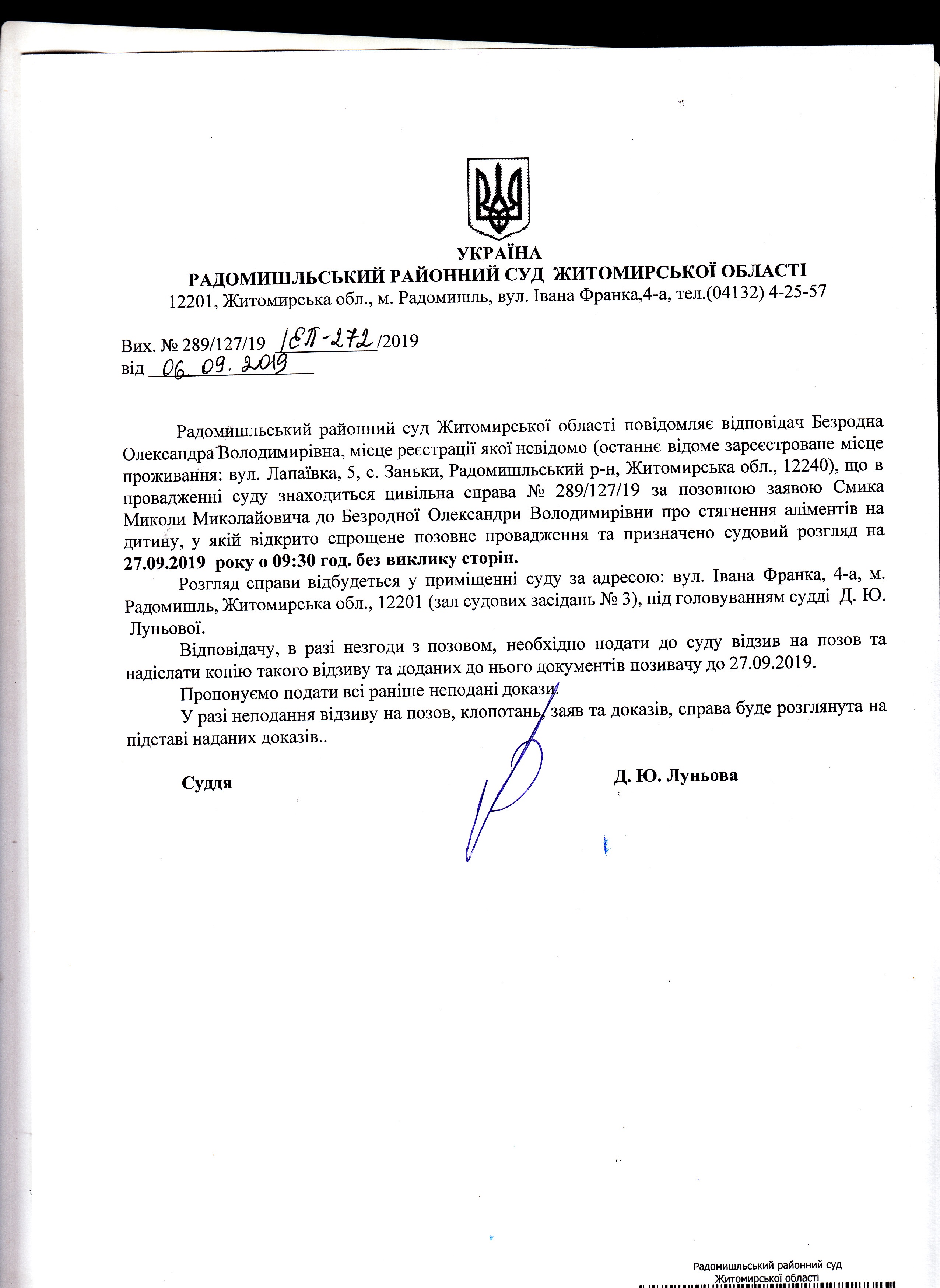 Оголошення про розгляд цивільної справи за позовною заявою Смика Миколи Миколайовича до Безродної Олександри Володимирівни про стягнення аліментів на дитину
