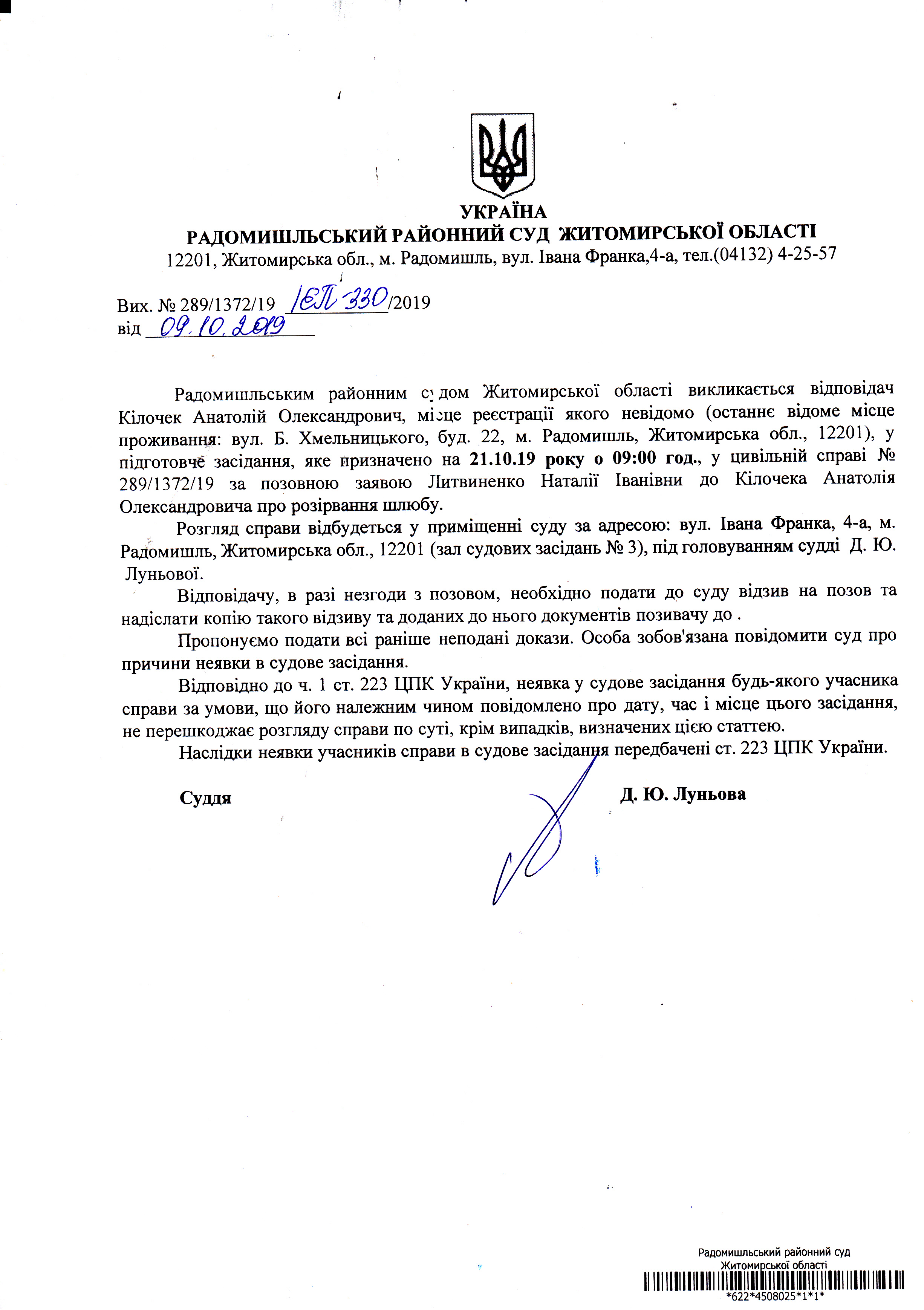 Оголошення про виклик до суду Кілочек Анатолія Олександровича
