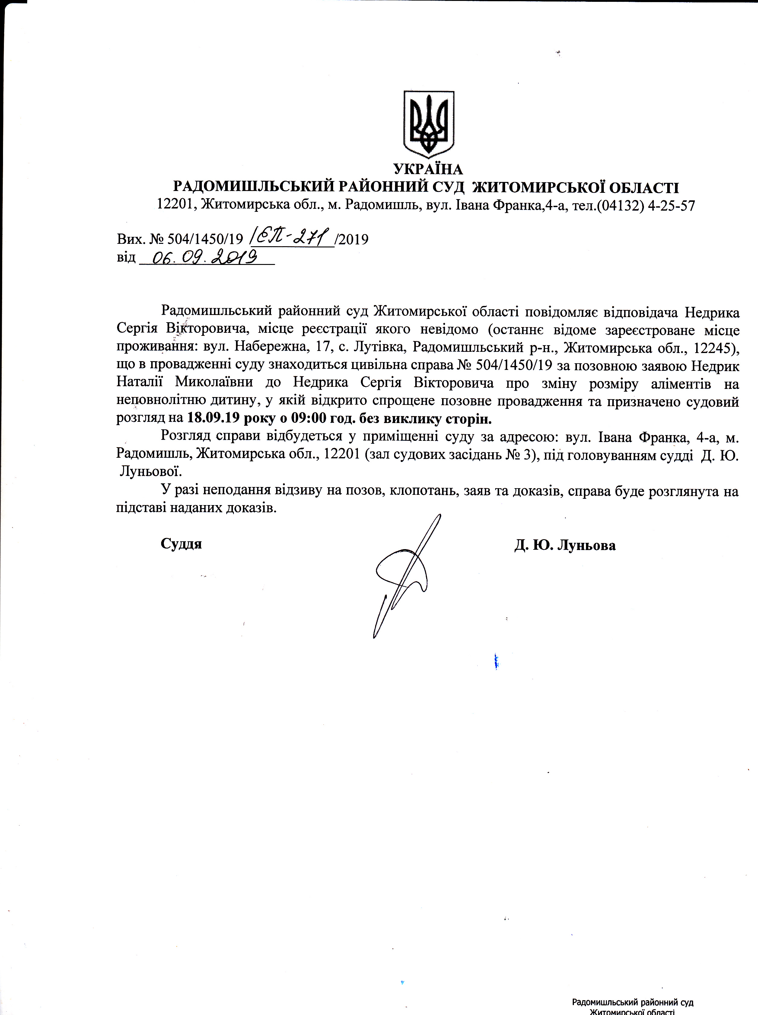 Оголошення про розгляд цивільної справи за позовною заявою Недрик Наталії Миколаївни до Недрика Сергія Вікторовича про зміну розміру аліментів