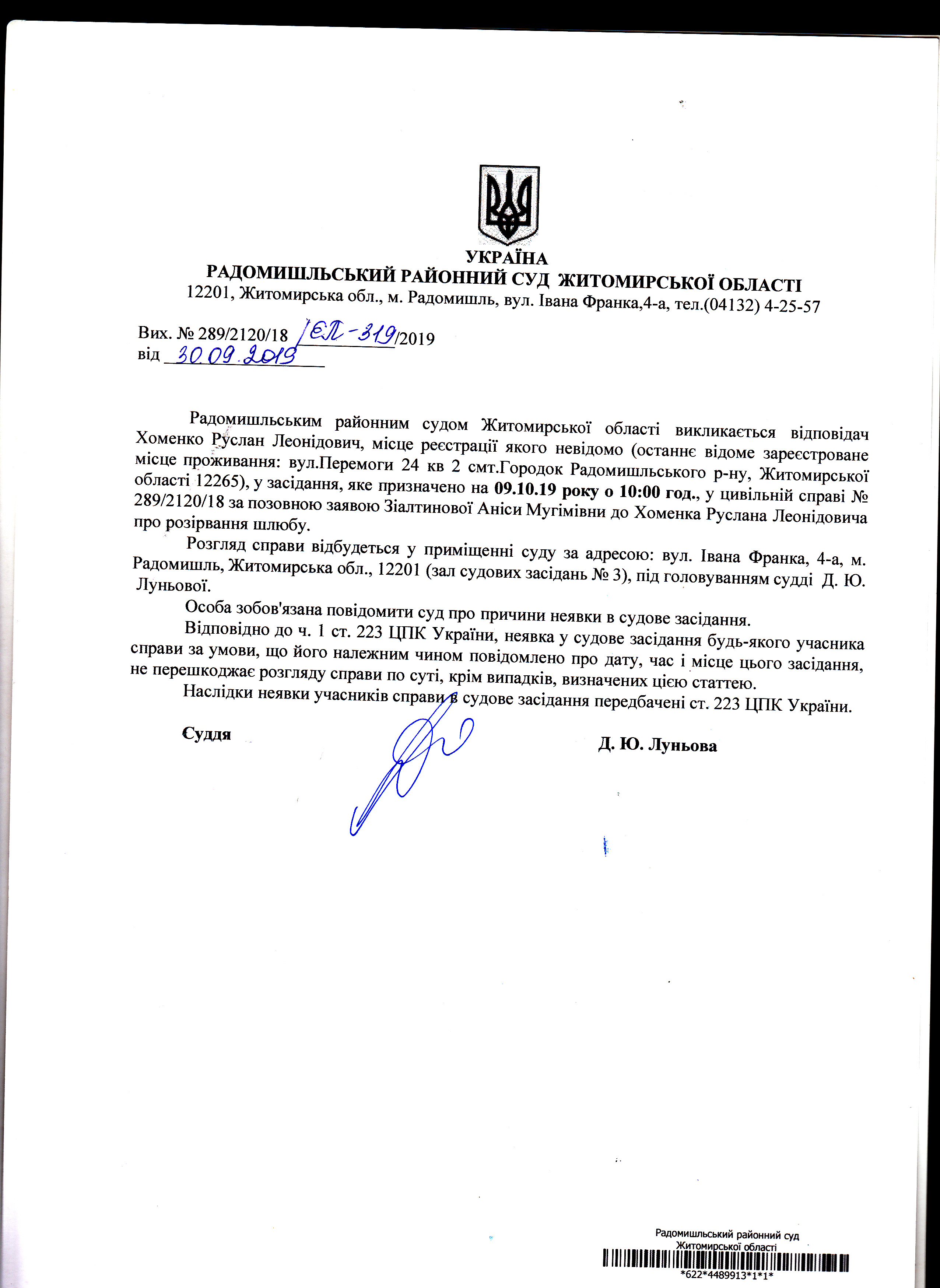 Оголошення про виклик до суду Хоменка Руслана Леонідовича
