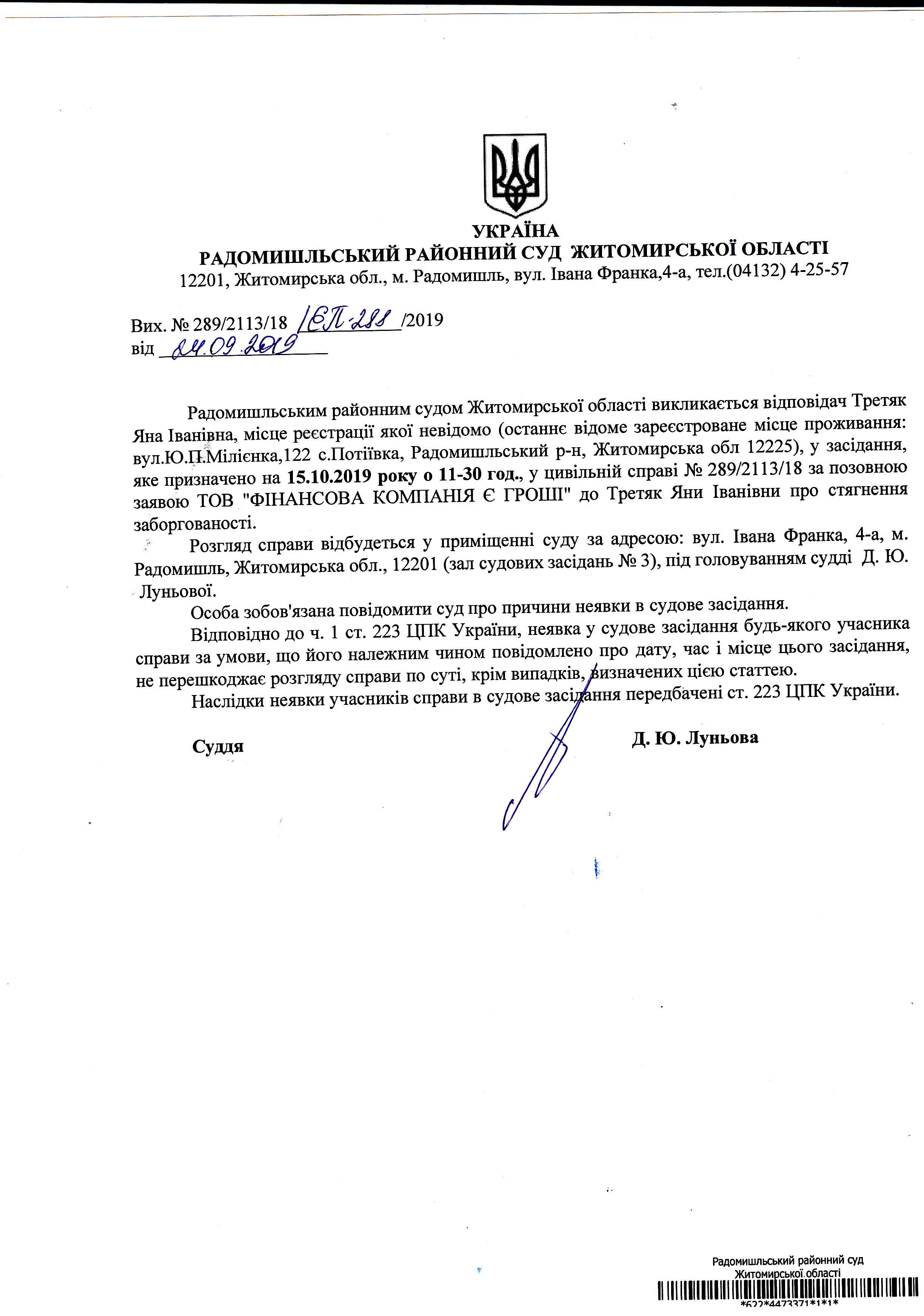 Оголошення про виклик до суду Третяк Яни Іванівни