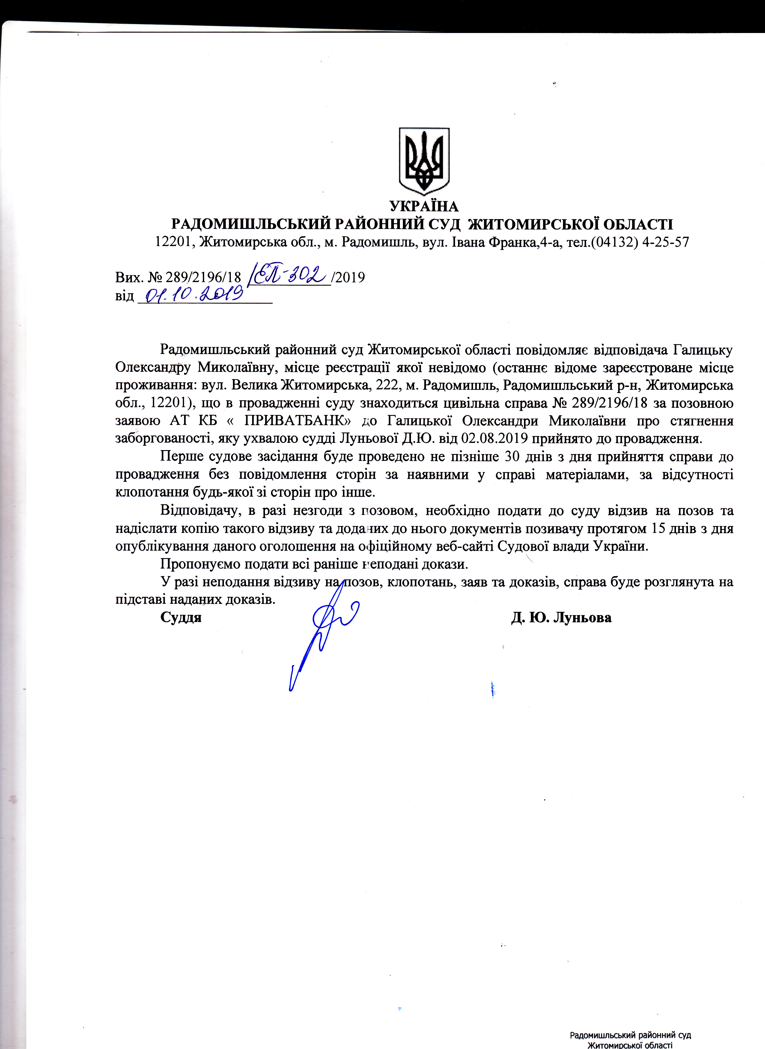 Оголошення про розгляд цивільної справи за позовною заявою АТ КБ « ПРИВАТБАНК» до Галицької Олександри Миколаївни про стягнення заборгованості