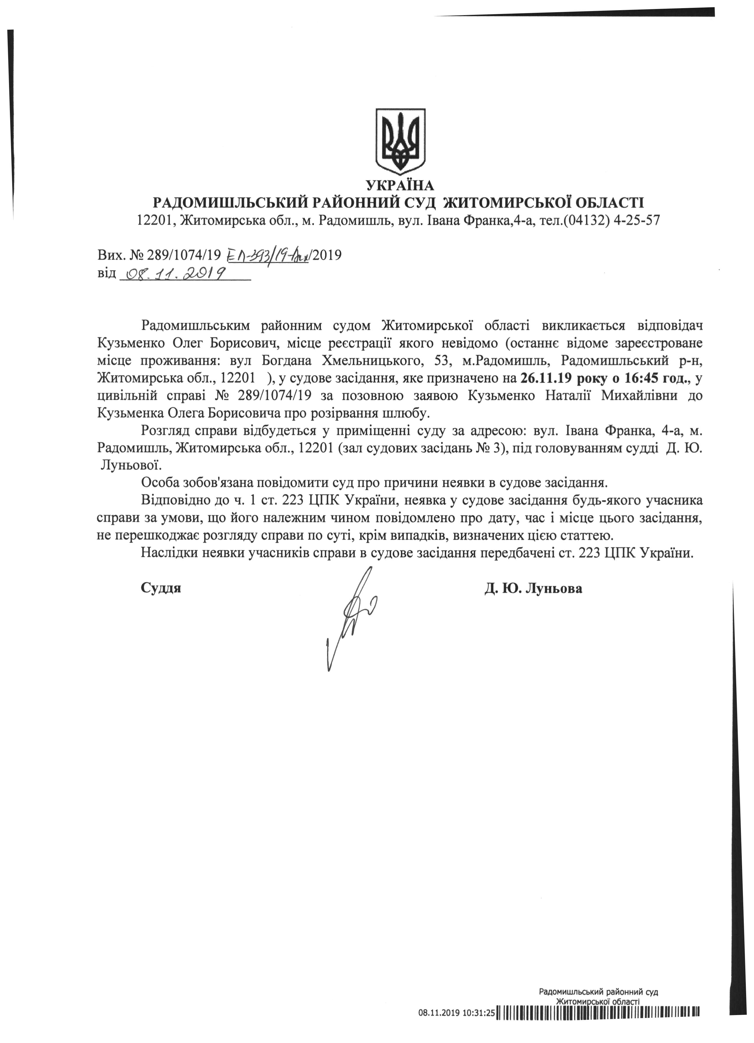 Оголошення про виклик до суду Кузьменка Олега Борисовича у цивільній справі № 289/1074/19 за позовною заявою Кузьменко Наталії Михайлівни до Кузьменка Олега Борисовича про розірвання шлюбу