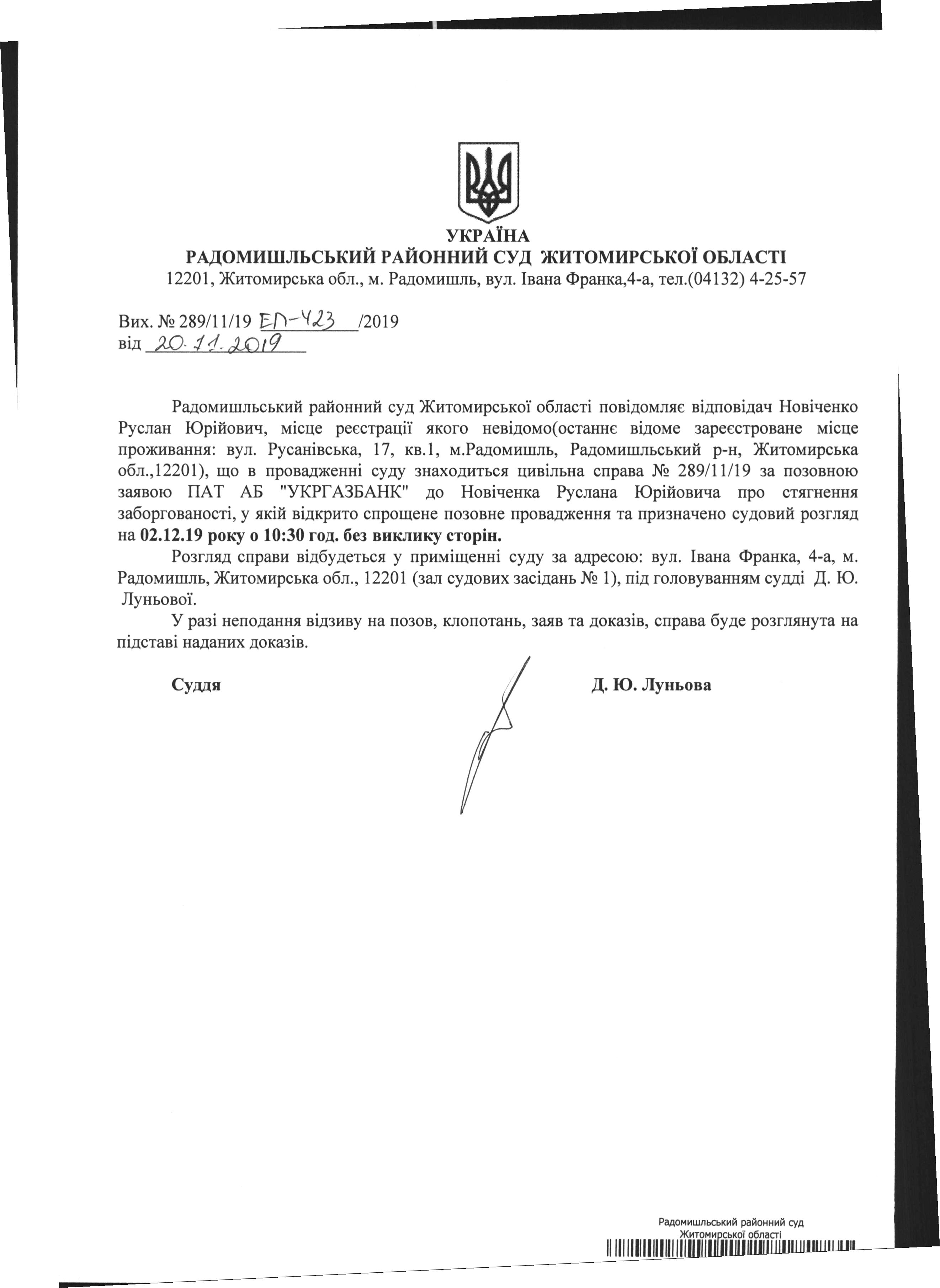 Оголошення про розгляд цивільної справи за позовною заявою ПАТ АБ "УКРГАЗБАНК" до Новіченка Руслана Юрійовича про стягнення заборгованості