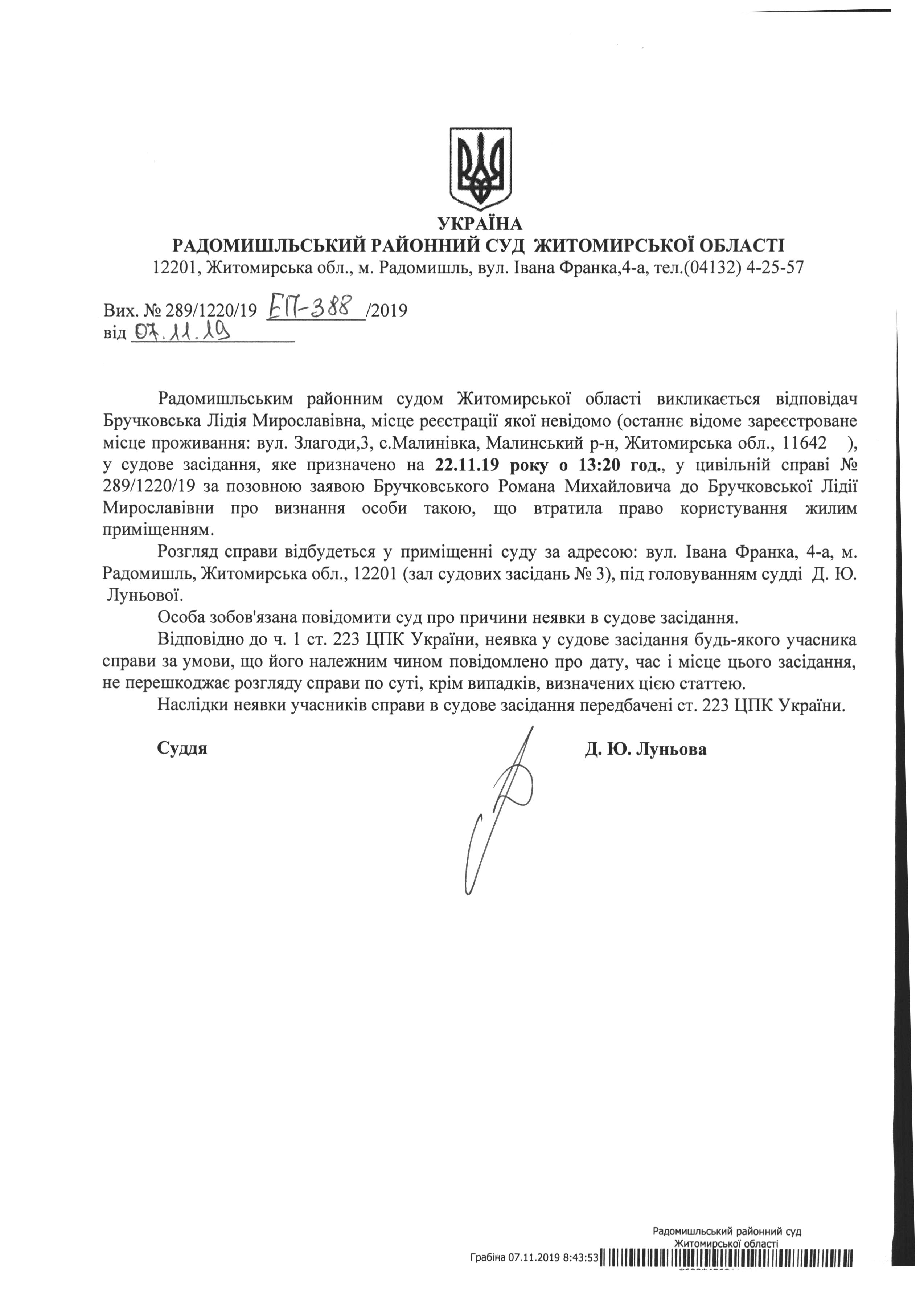 Оголошення про виклик до суду Бручковської Лідії Мирославівни у цивільній справі № 289/1220/19 за позовною заявою Бручковського Романа Михайловича до Бручковської Лідії Мирославівни про визнання особи такою, що втратила право користування жилим приміщенням
