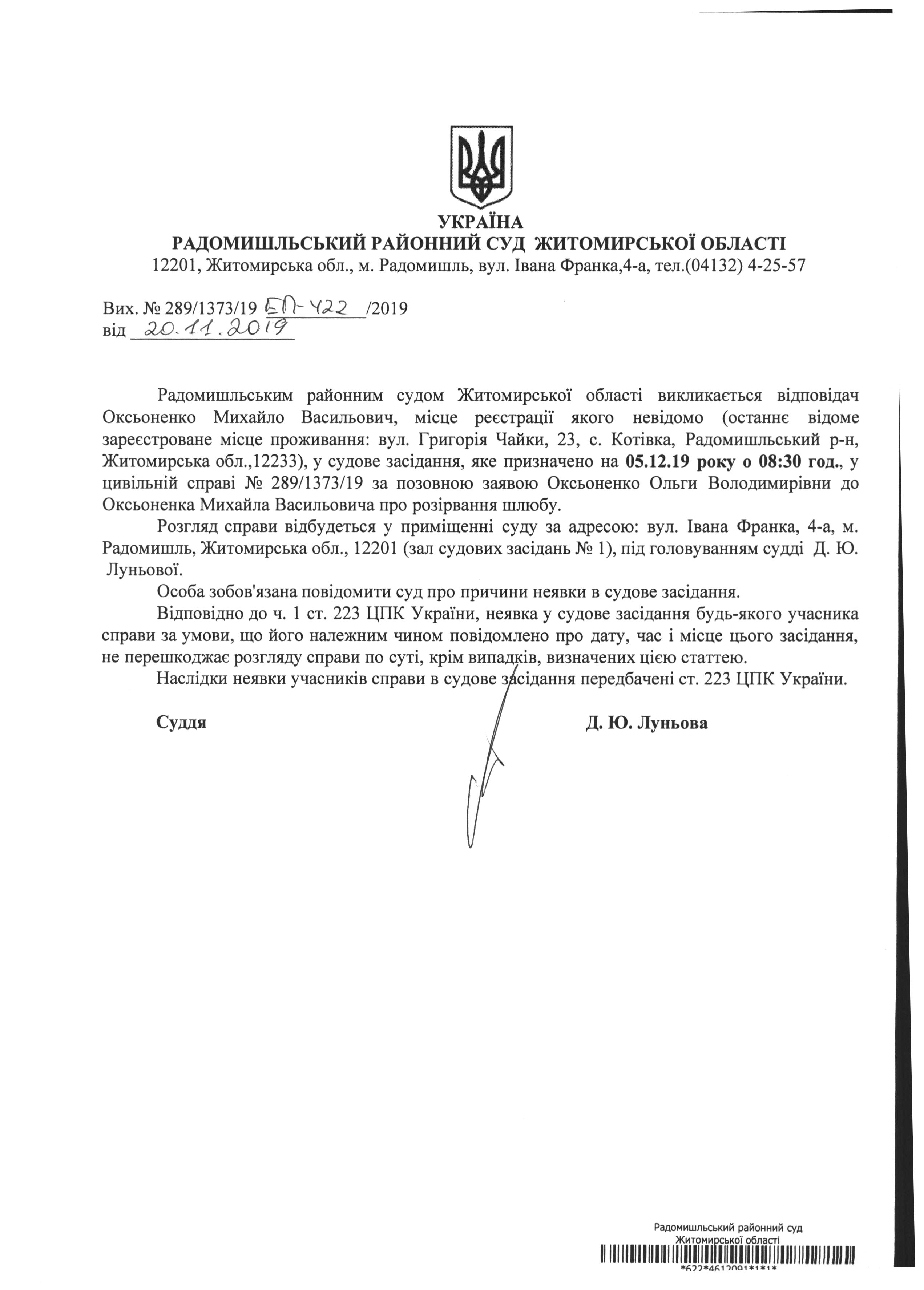 Оголошення про виклик до суду Оксьоненка Михайла Васильовича у цивільній справі № 289/1373/19 за позовною заявою Оксьоненко Ольги Володимирівни до Оксьоненка Михайла Васильовича про розірвання шлюбу