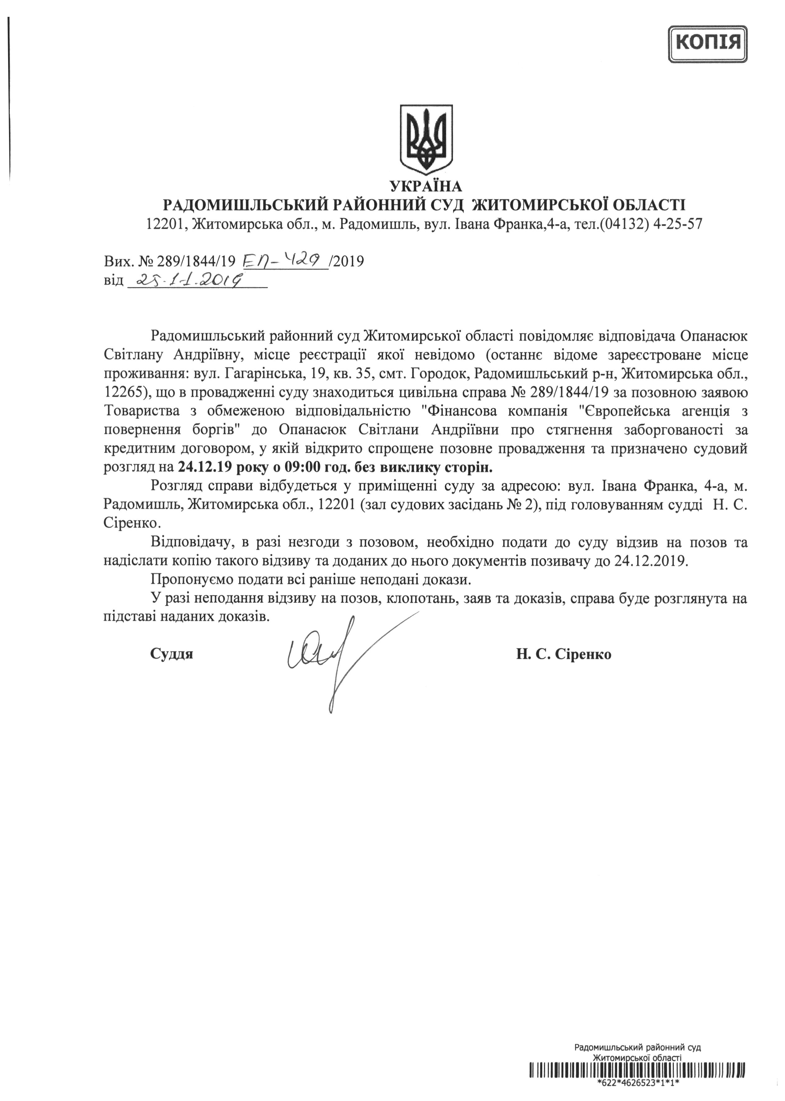 Оголошення про розгляд цивільної справи за позовною заявою Товариства з обмеженою відповідальністю "Фінансова компанія "Європейська агенція з повернення боргів" до Опанасюк Світлани Андріївни про стягнення заборгованості за кредитним договором