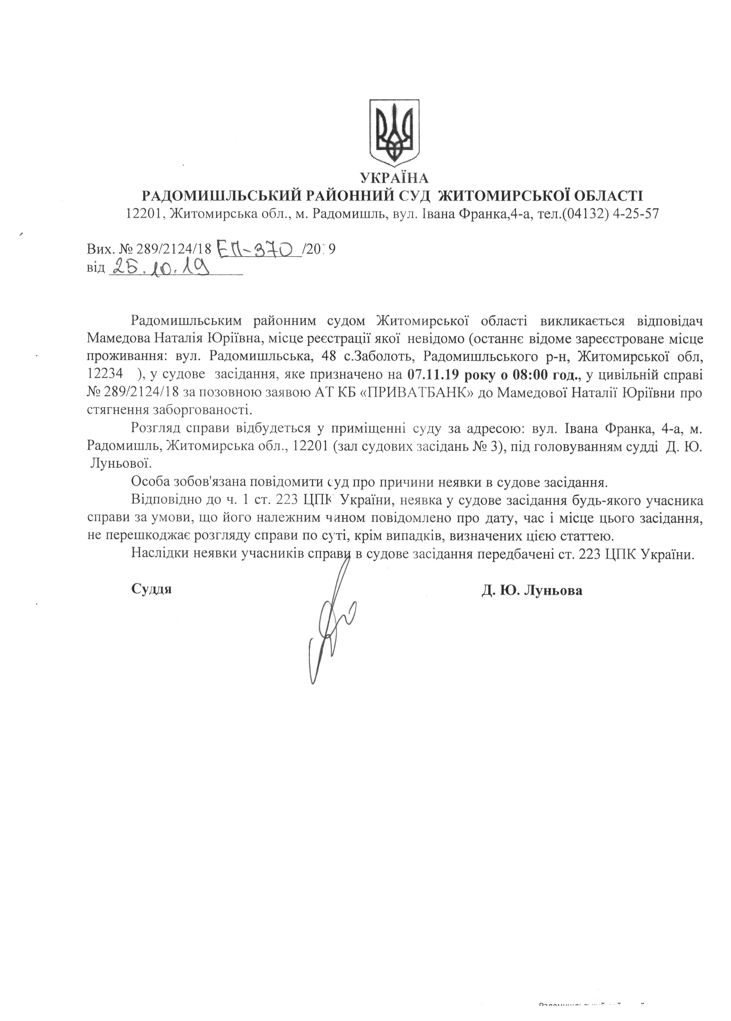 Оголошення про виклик до суду Мамедової Наталії Юріївни у цивільній справі № 289/2124/18 за позовною заявою АТ КБ «ПРИВАТБАНК» до Мамедової Наталії Юріївни про стягнення заборгованості
