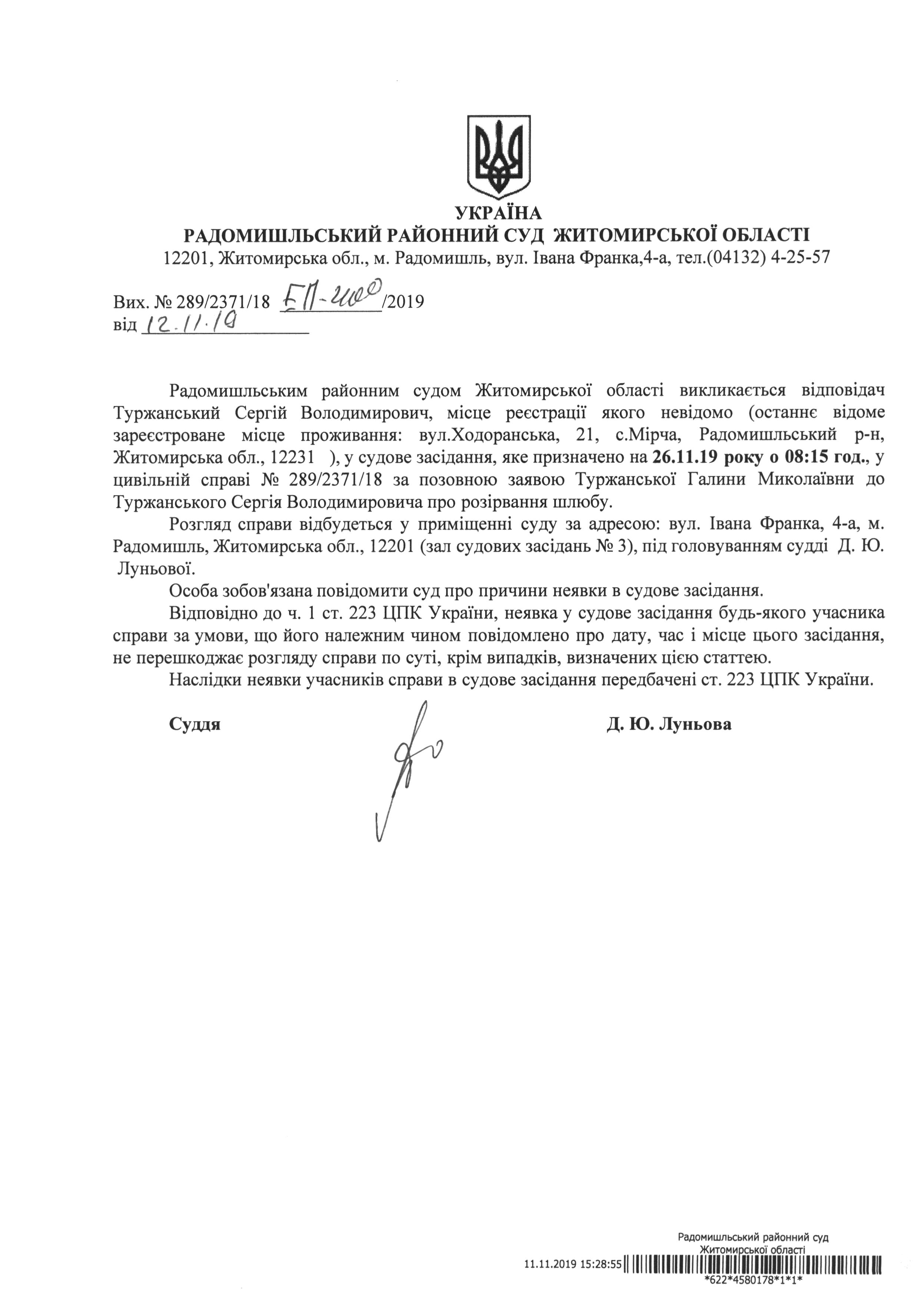 Оголошення про виклик до суду Туржанського Сергія Володимировича у цивільній справі № 289/2371/18 за позовною заявою Туржанської Галини Миколаївни до Туржанського Сергія Володимировича про розірвання шлюбу