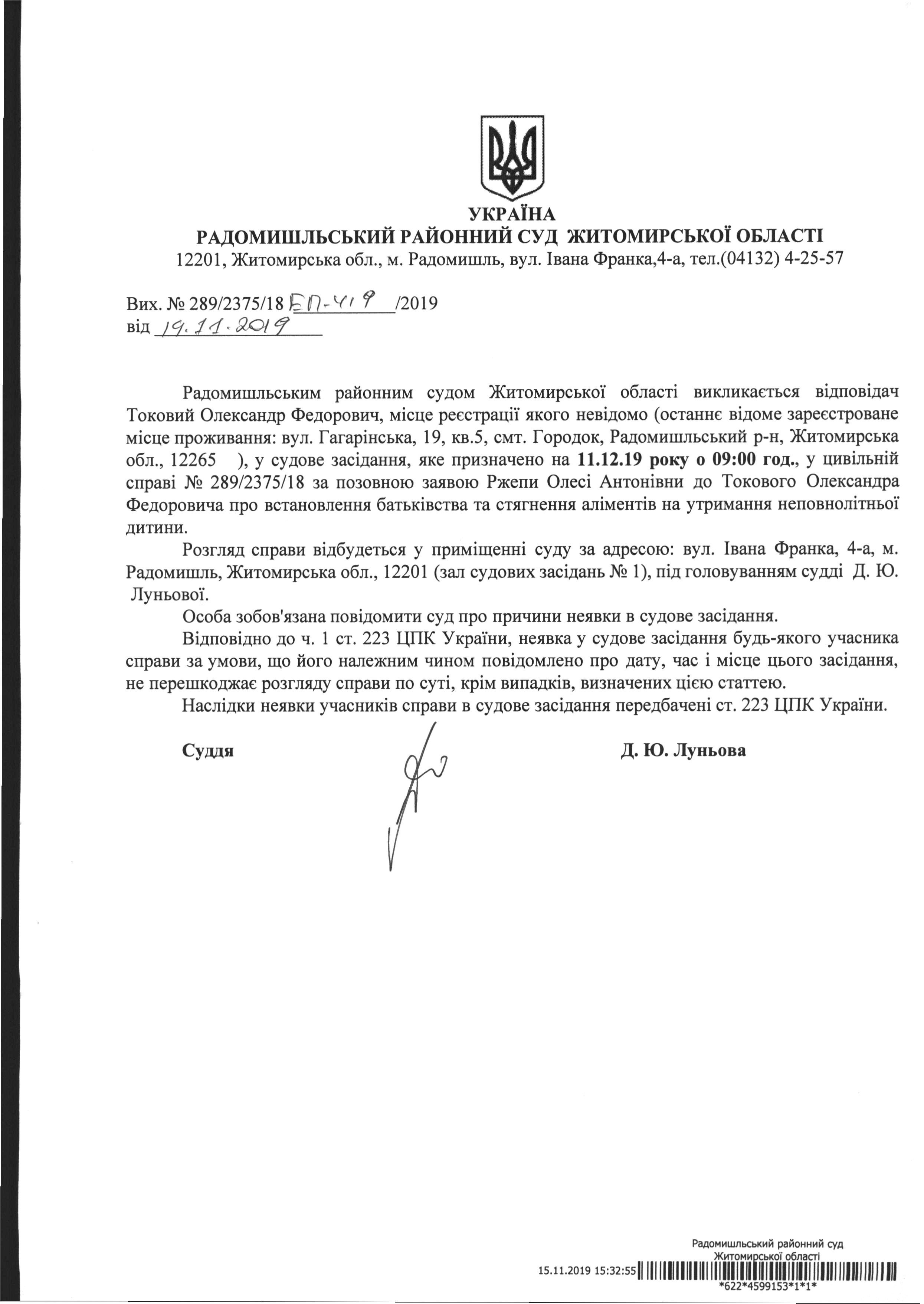 Оголошення про виклик до суду Токового Олександра Федоровича у цивільній справі № 289/2375/18 за позовною заявою Ржепи Олесі Антонівни до Токового Олександра Федоровича про встановлення батьківства та стягнення аліментів на утримання неповнолітньої дитини