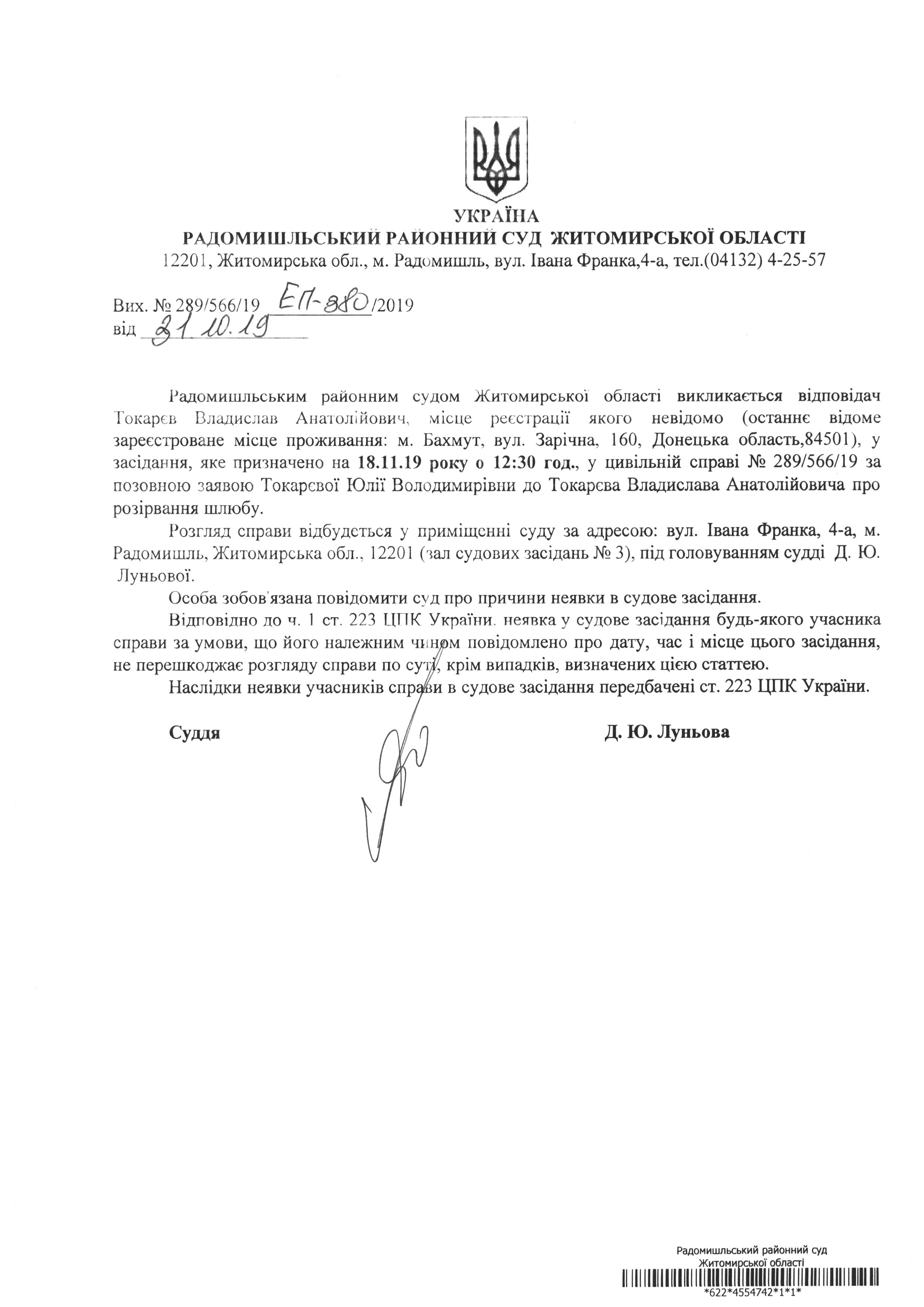 Оголошення про виклик до суду Токарева Владислава Анатолійовича у цивільній справі № 289/566/19 за позовною заявою Токаревої Юлії Володимирівни до Токарева Владислава Анатолійовича про розірвання шлюбу.