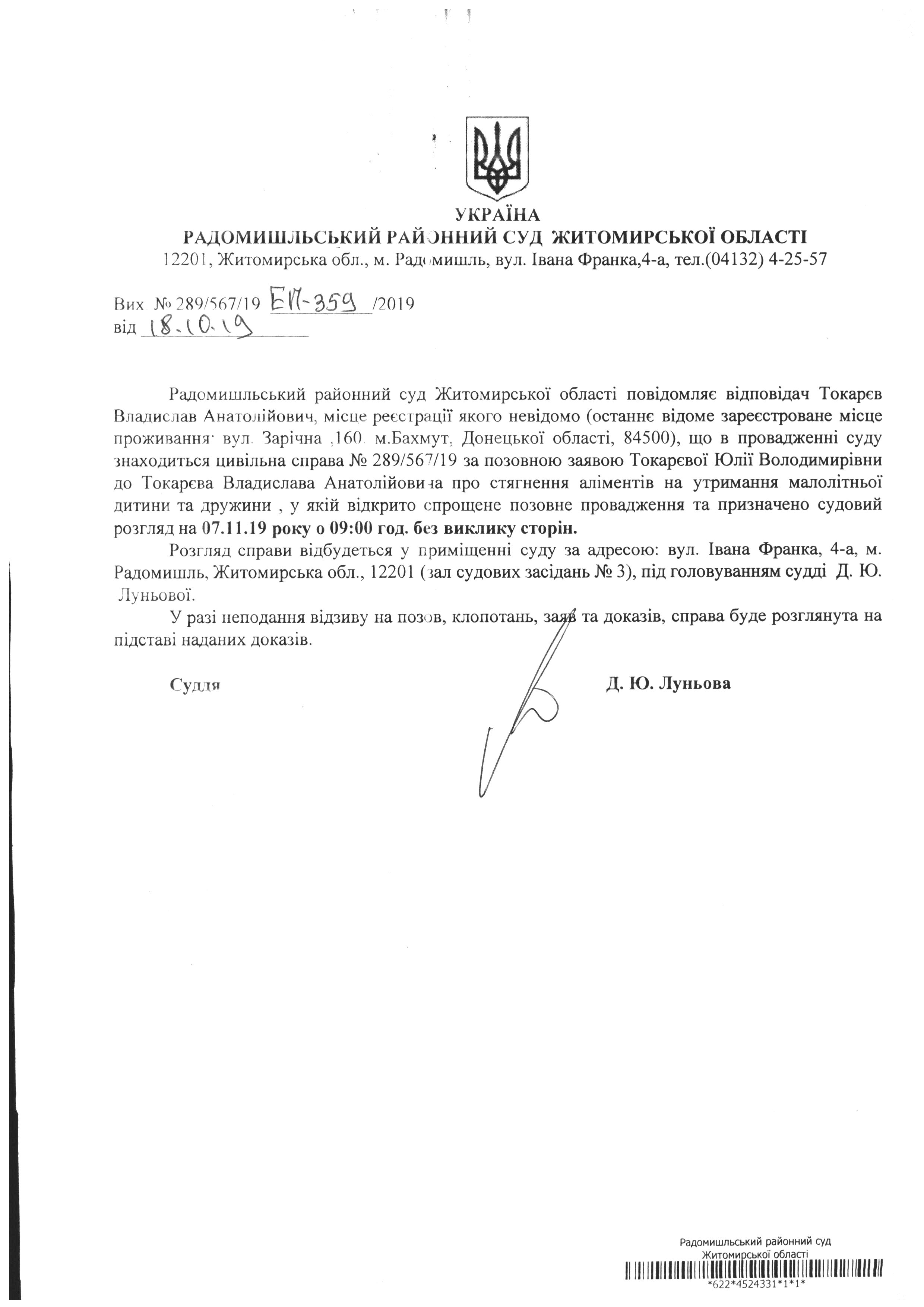 Оголошення про розгляд цивільна справа № 289/567/19 за позовною заявою Токаревої Юлії Володимирівни до Токарева Владислава Анатолійович про стягнення аліментів на утримання малолітньої дитини та дружини , у якій відкрито спрощене позовне провадження.