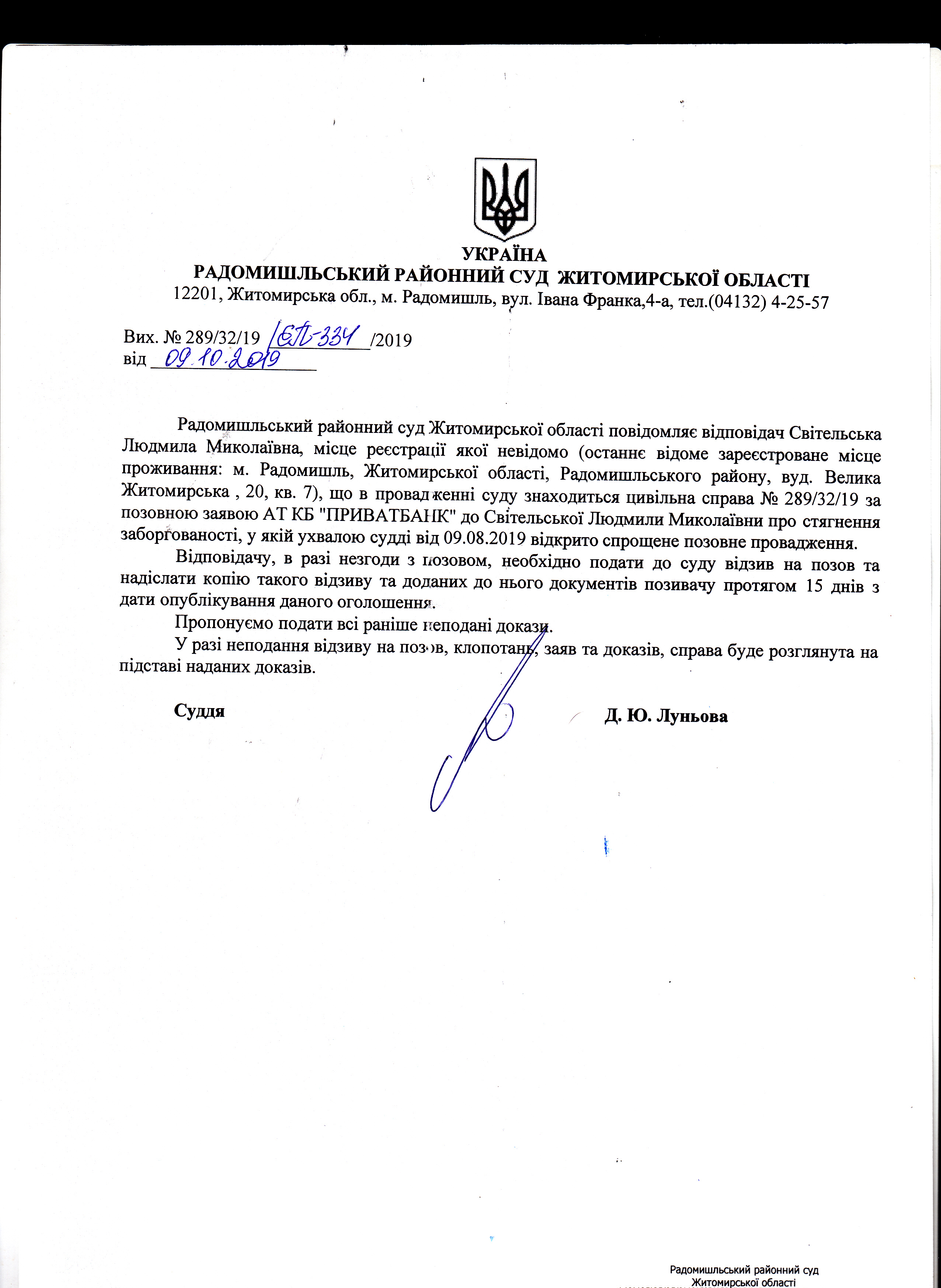 Оголошення про розгляд цивільної справи за позовною заявою АТ КБ "ПРИВАТБАНК" до Світельської Людмили Миколаївни про стягнення заборгованості