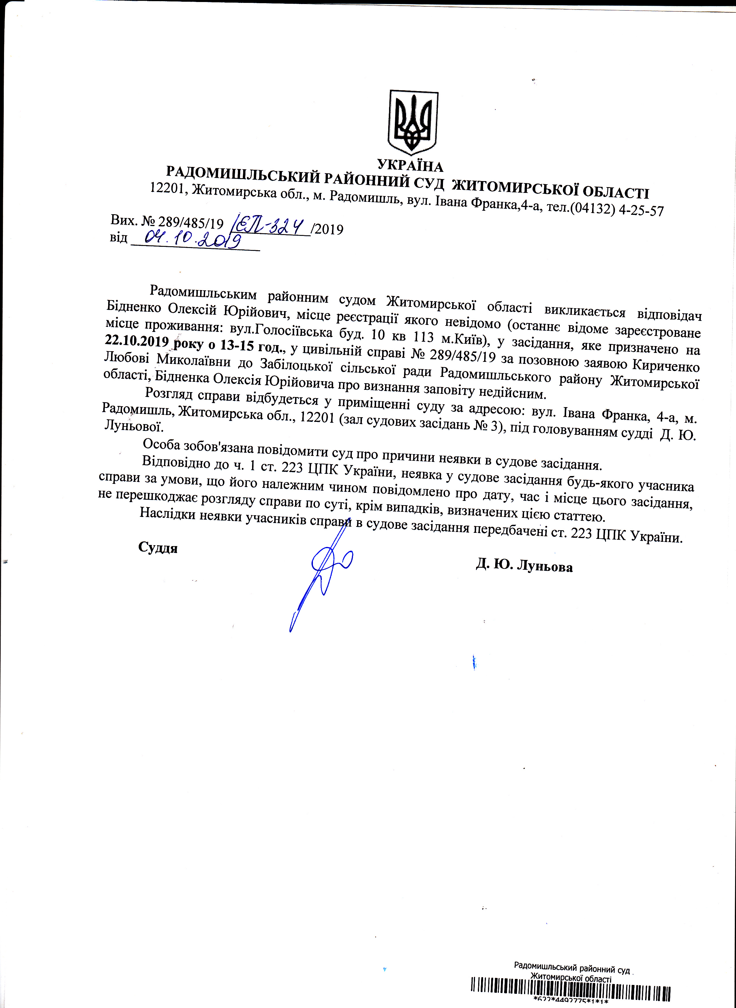 Оголошення про виклик до суду Бідненка Олексія Юрійовича