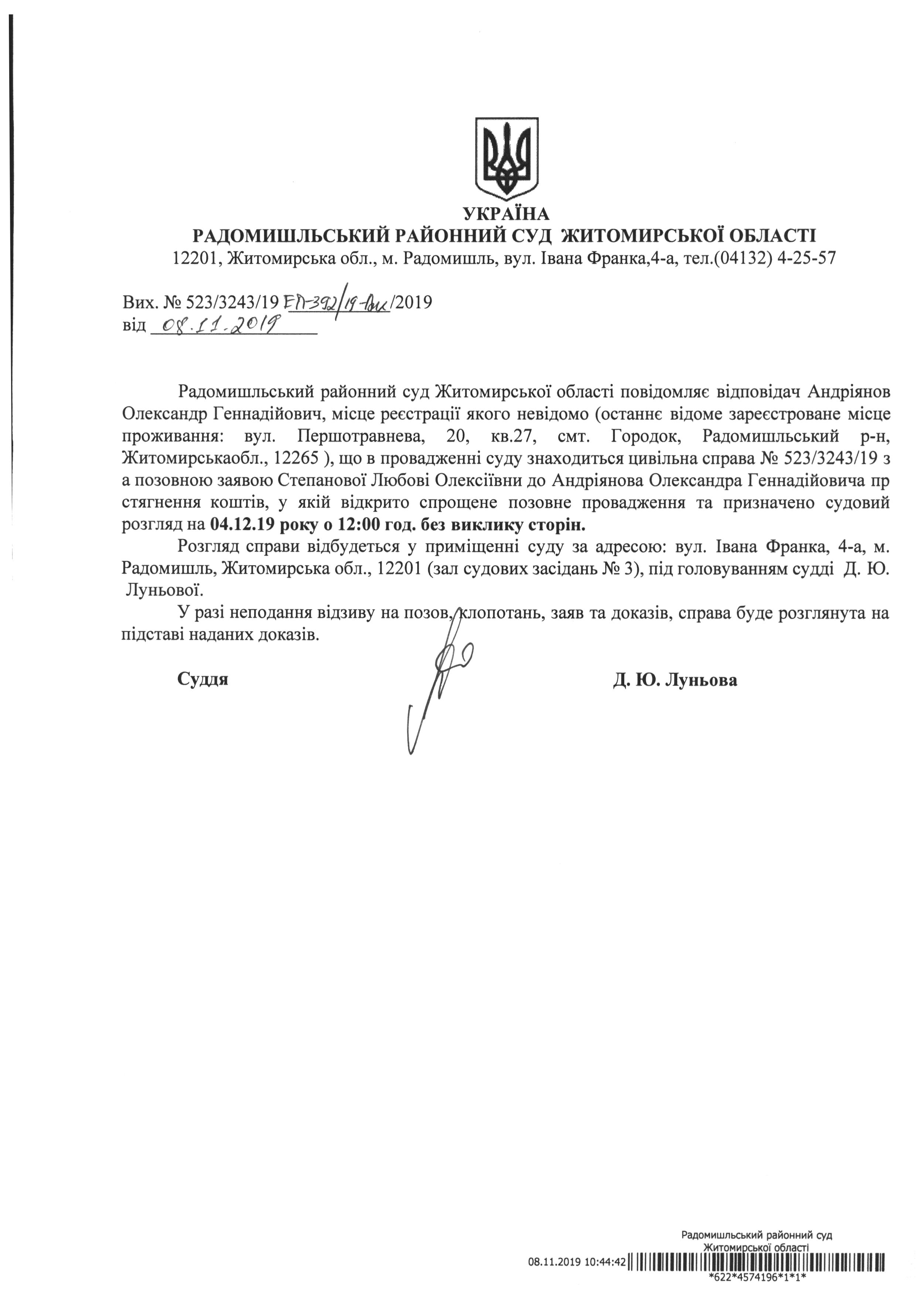 Оголошення про розгляд цивільної справи за позовною заявою Степанової Любові Олексіївни до Андріянова Олександра Геннадійовича пр стягнення коштів