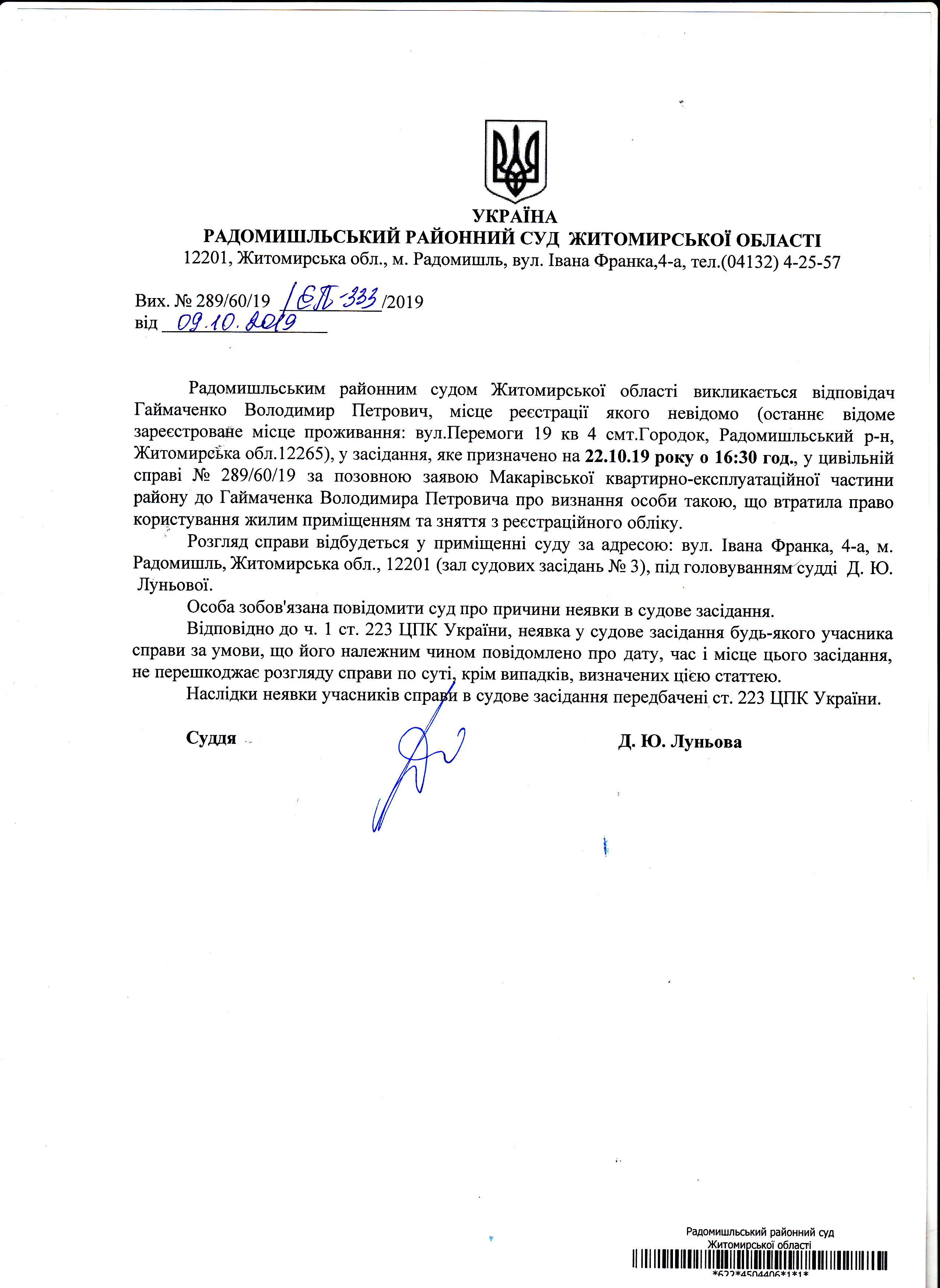 Оголошення про виклик до суду Гаймаченка Володимира Петровича
