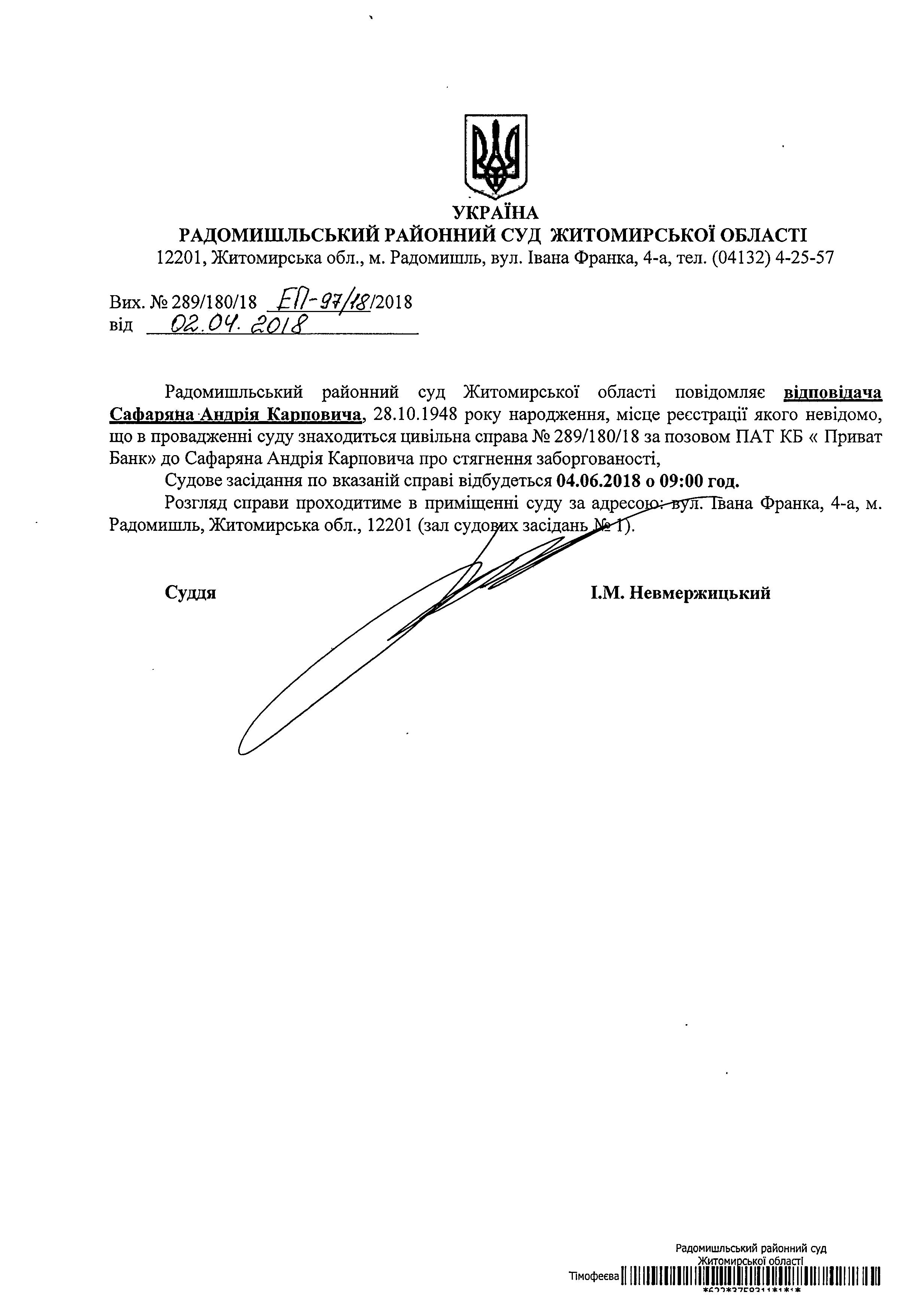 Оголошення про виклик до суду Сафаряна Андрія Карповичпа