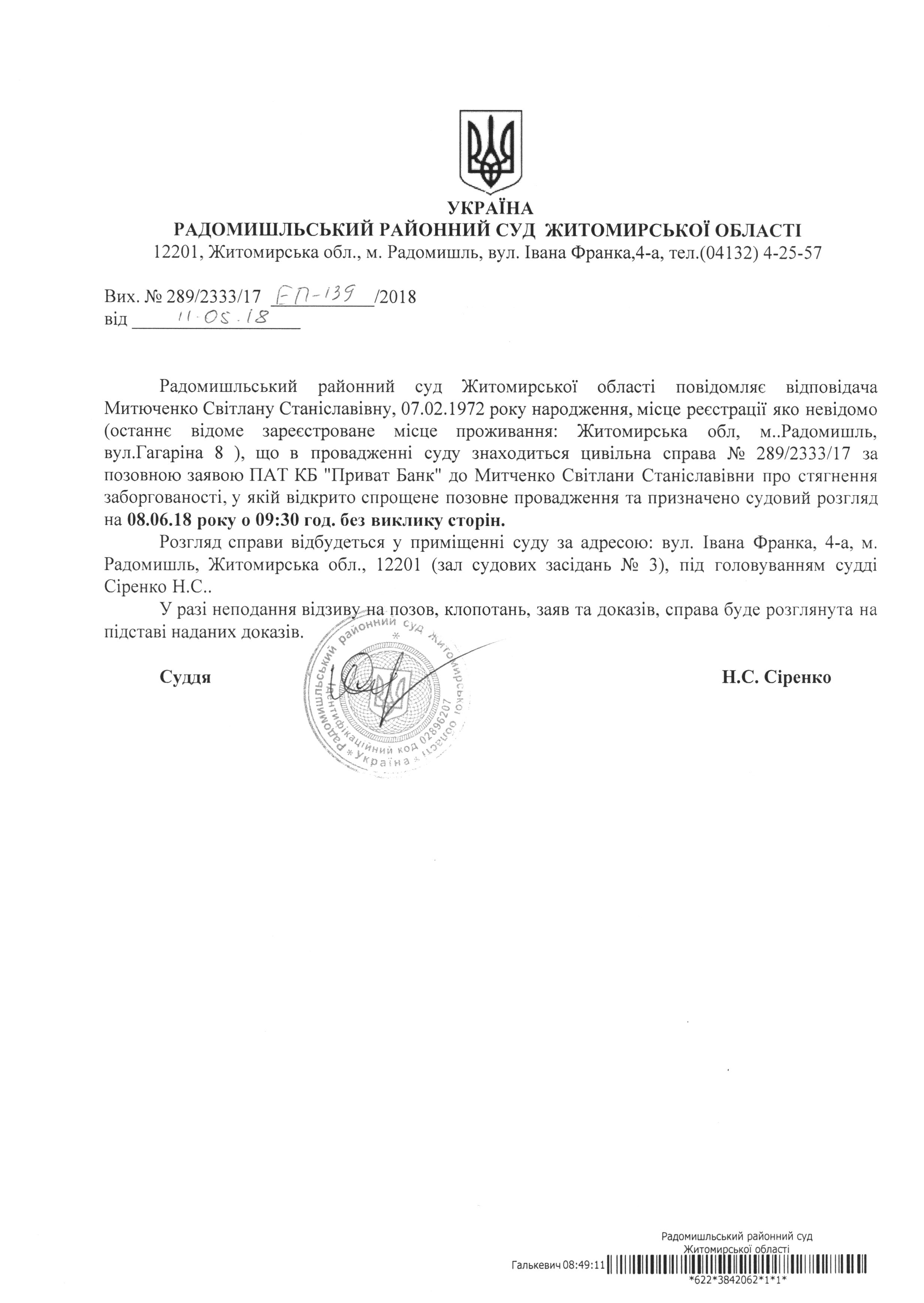 Оголошення про виклик до суду Митченко Світлани Станіславівни