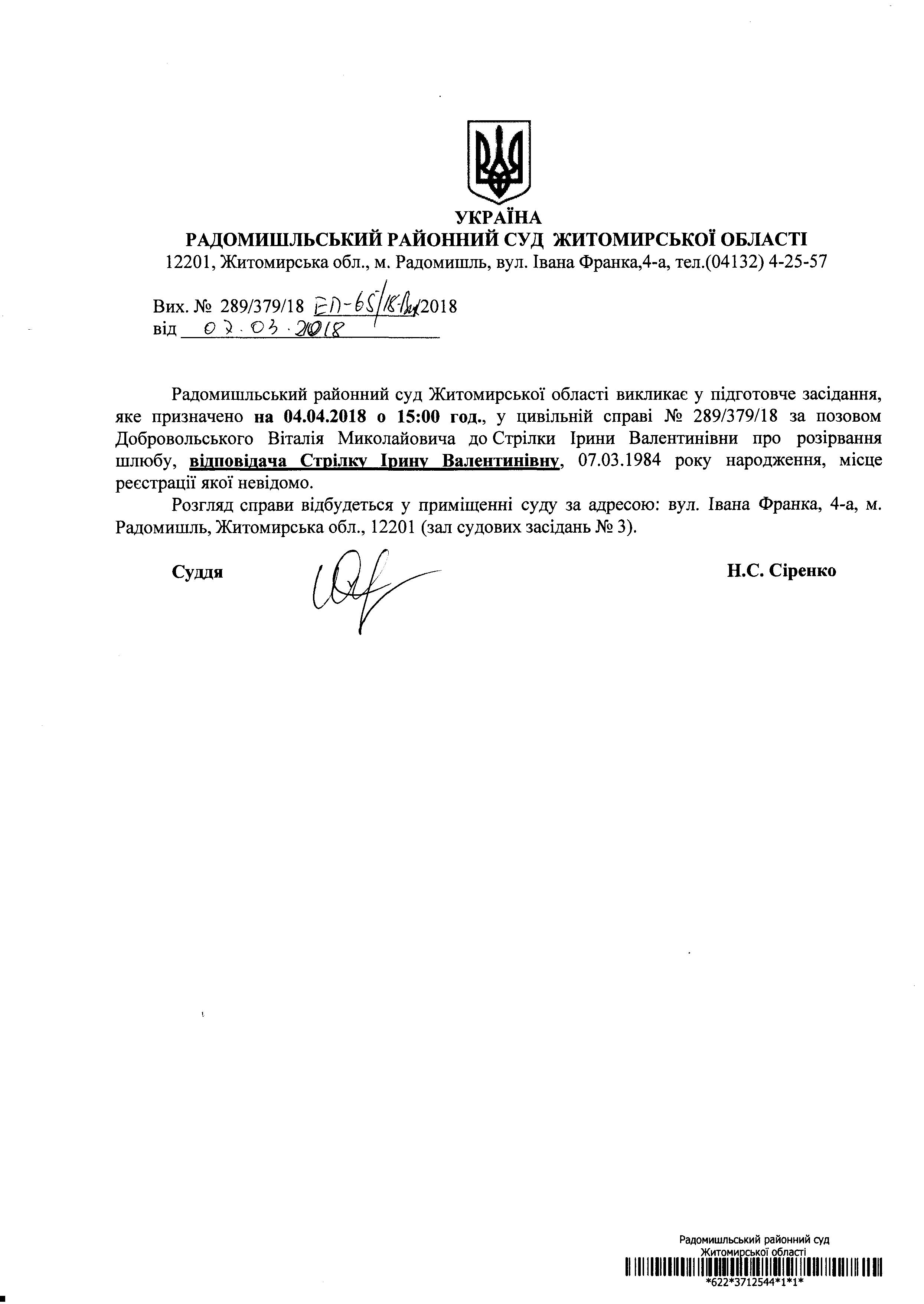 Оголошення про виклик до суду Стрілки Ірини Валентинівни.