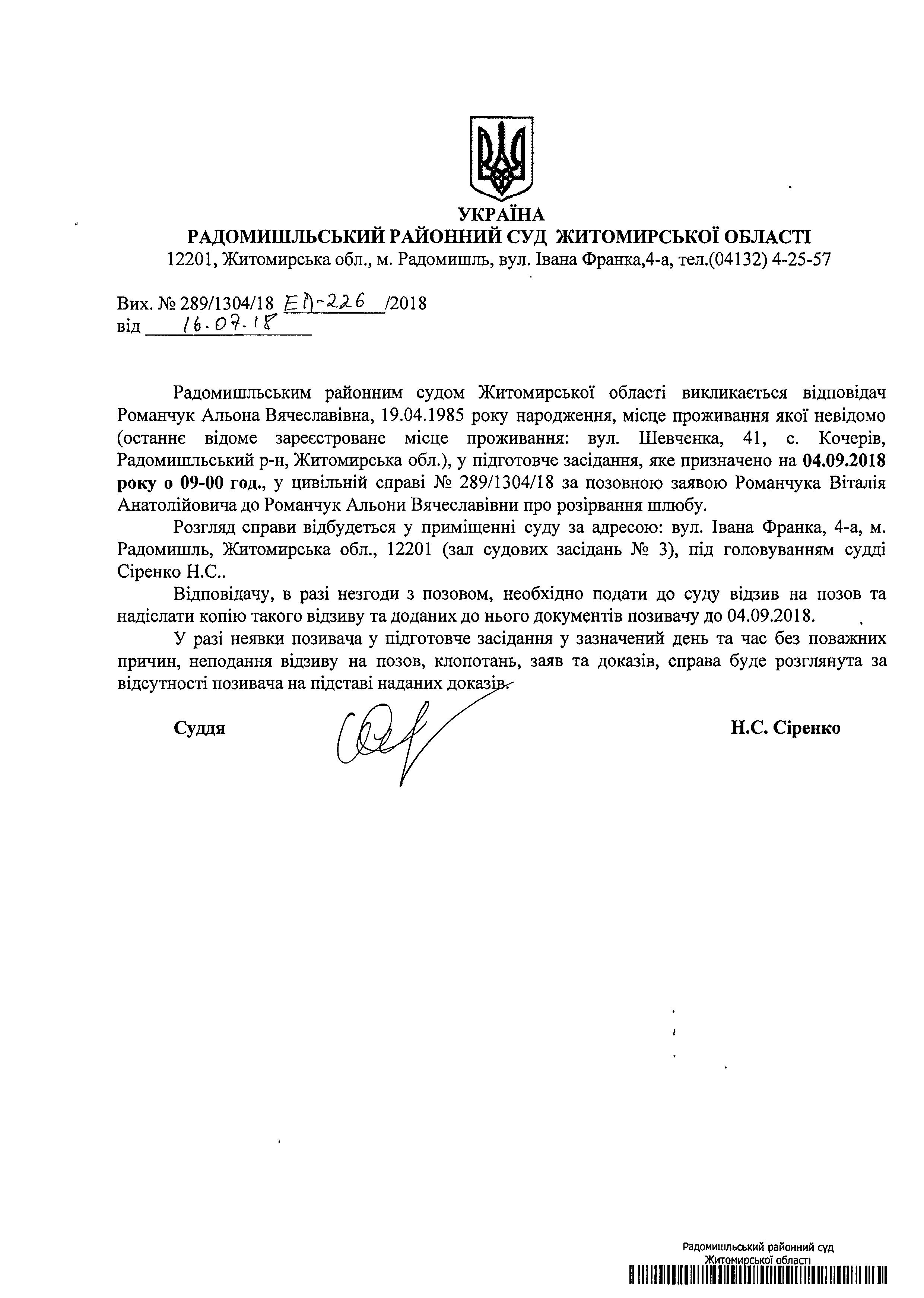 Оголошення про виклик до суду Романчук Альони В"ячеславівни