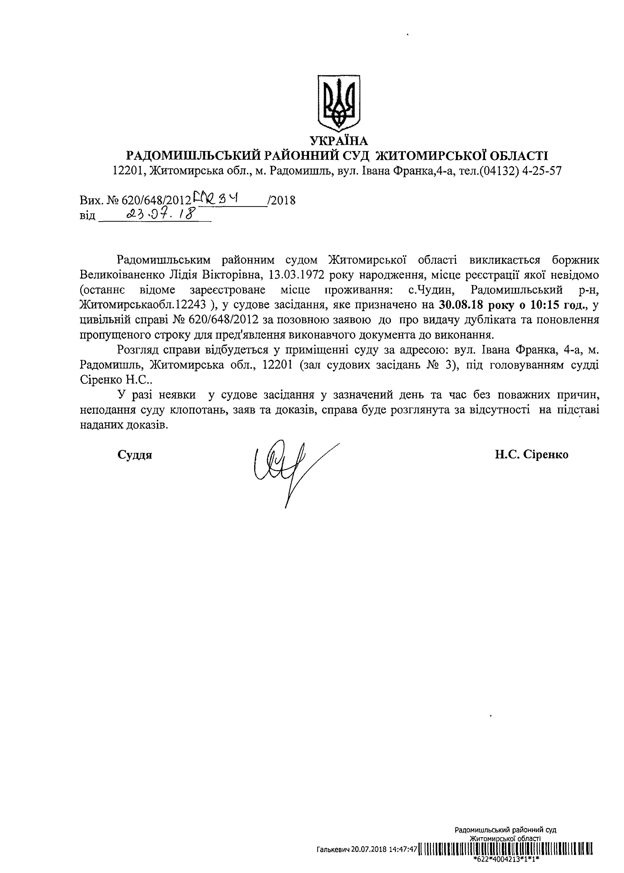Оголошення про виклик до суду Великоіваненко Лідії Вікторівни
