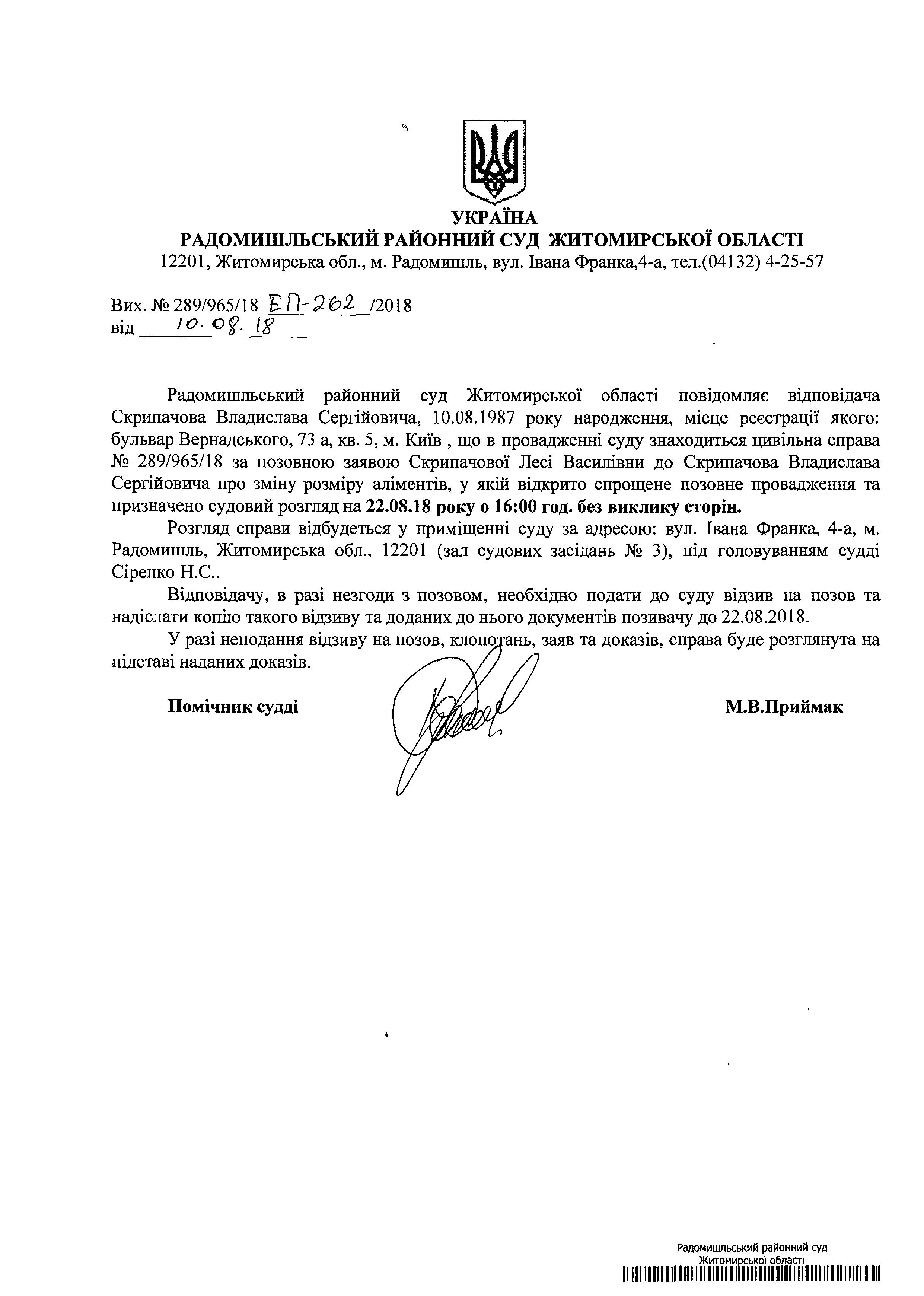 Оголошення про виклик до суду Скрипачова Владислава Сергійовича