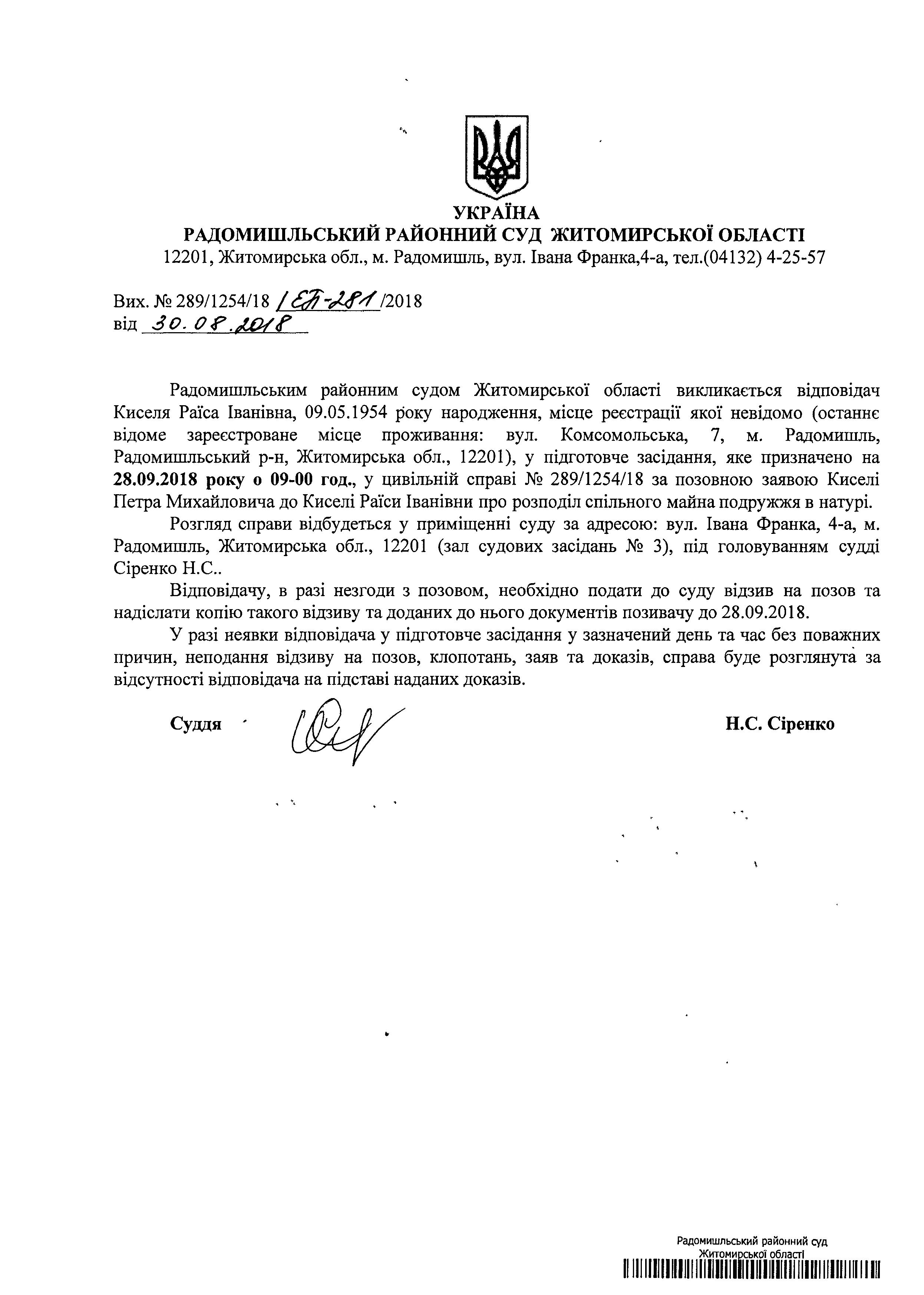 Оголошення про виклик до суду Киселя Раїси Іванівни