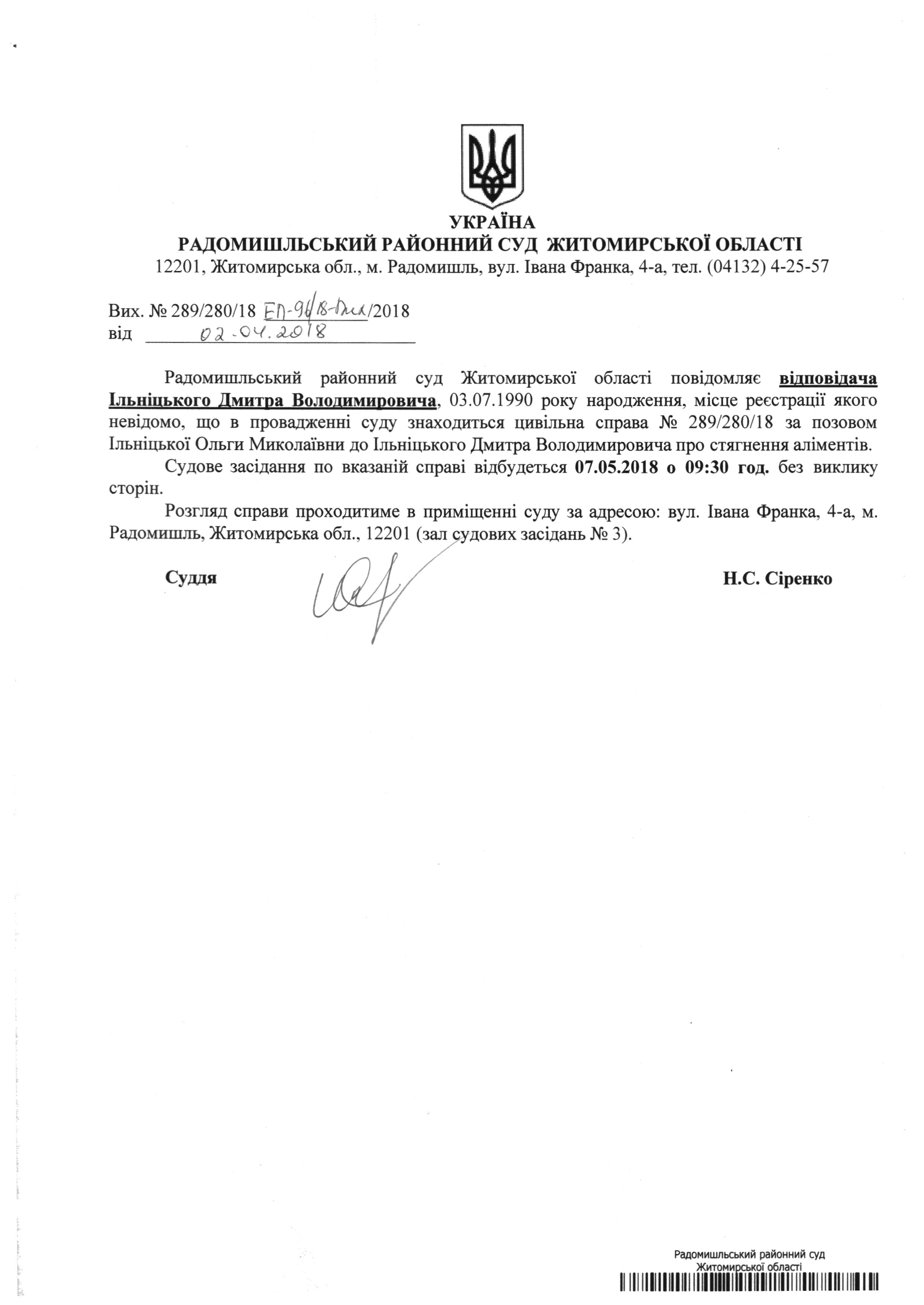 Оголошення про виклик до суду Ільницького Дмитра Володимировича